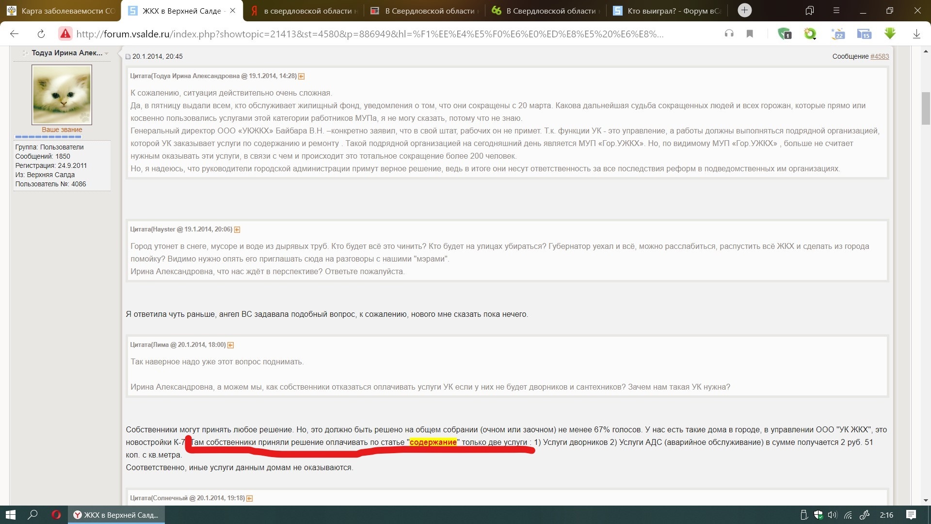 Форумчане! Есть среди вас люди с критическим мышлением, думающие. одна из них Зловрердина и те, кто хоть как-то пытается оценить объективно картину обстановки на МУП Наконец, пришел внешний управляющий, который решил прекратить кумовство... К сожалению, Тодуа, как исполнительный директор умышленно срывала работу УК Отдавала приказы Решетовой не выполнять обращения жителей в УК, в связи с чем и стали проводится встречи с жильцами в УК, шел подрыв и в диспетчерской службе, где срывались звонки от жильцов. По кошению травы!!! Тодуа заключала не выгодные контракты на покос, тем самым загоняя предприятие еще в большие убытки... Внешний Управляющий прекратил данный беспредел...для общего сведения, не УРСО Екатеринбурга, не УРСО МОСКВЫ не выбирает конкурсного управляющего... , только путем большинства голосов и назначение по решению Арбитражного суда, поэтому думать, что все куплены и ставленники большое заблуждение.... Теперь о том, что УК не платит МУП, кливетничество, иначе как было бы возможно содержать штат, никто добровольно не ушел, более того прокуратура еженедельно делает запрос в УК о денежных движениях и операциях между МУП И УК, иначе полетели бы головы в управляющей. Насколько известно, теперь УК занимается активно и взысканием задолженности с населения и каждую среду отчитывается в прокуратуру. МУП этим не занималось и не взыскивало, но кормилось с договора, теперь все под контролем прокуратуры. К сожалению, приходиться наблюдать раздувательство на форуме, неправдоподобными и лживыми заявлениями в адрес МУП И УК сподвижников Ирины Александровны Пожалуйста, думайте о том, что за назначенными лицами пристальное внимание со всех сторон, это вам не местные, где кум на куме сидит и ими погоняет....за людьми из Екатеринбурга наблюдают все органы и они держат удар по букве закона!!!! Теперь о летних работах на домах, они ведутся, все виды оговорены с представителями домов, прокуратура следит за тем, чтобы не был сорван отопительный сезон и МУП И УК имеют на руках прокурорское предостережение. Теперь мы все ждем слово Савченко, чтобы он дал вразумительный комментарий и погасил не нужный пожар страстей. Конечно среди жителей Верхней Салды есть люди с критическим мышлением, и не много сведущие в теме ЖКХ, а так же отслеживающие эту тему. А так же Салда по Екатеринбургским меркам городок не большой и все в курсе всего. И прекрасно знают, что с момента создания УК с 2009г. всю работу по содержанию и ремонту домов выполняет МУП, а УК только собирает деньги и оказывает услуги непосредственно по управлению, и то частично, так как и домоуправы и инженера в штате МУПа. Каким образом МУП срывает работу УК не понятно, если МУП и делает всю эту работу, правда в последнее время за бесплатно. Что то Вы искажаете информацию об отсутствии задолженности и умалчиваете, что УК имеет задолженность перед МУПом по договорам субподряда по содержанию и ремонту жилья в размере практически 40 млн., то есть полгода не платежей. И в прокуратуру вы подаете информацию по данным УК, где счета от МУПа не проведены, мотивируя тем что работы не приняты жильцами. А не ваша ли это прямая обязанность, как Управляющей компании подписывать акты жильцами. Подрядчиков может быть много, а акт выполненных работ один. Вот из за неплатежей УК у МУП и наращивается задолженность и за свет, 