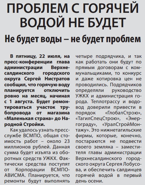 УЖКХ виновато в том, что ВСМПО довело сети и коммуникации до износа в 70-80%, а потом избавилось от непрофильного актива? Знали бы вы как, простите, достали представители УЖКХ представителей ВСМПО при этой передаче З.Ы. Где были представители общественности, журналисты Новатора и прочих газет, когда производилась передача? Новатор - это как профсоюз, никогда против работодателя слова не напишет, а сейчас конечно, удобно к баннерам прицепиться. Простите, а кто менял трубопровод около администрации и возле "все для вас"? УЖКХ? Или все-же службы ВСМПО? -------------------- Per Rectum Ad Astra/ Лат.