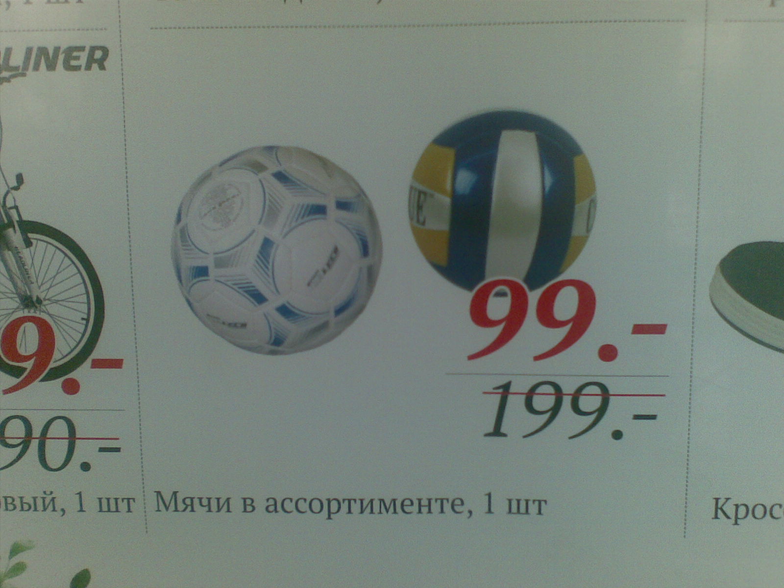 Были сегодня в магазине "Магнит" что находится в "Рождественском". Весит у входа вывеска с рекламой (акцией) что - мячи по цене 99 руб. Ну в общем решили взять для ребенка, с экономить типа. Но при покупки чудным образом он стал стоить 199 руб. На вопрос как это так если у вас написано- что мячи по 99р. На то кассир ответила - это только волейбольные по 99р., а футбольные по 199 р. Ну ладно думаю, наверно я не правильно прочитал. Подошел снова к вывеске, читаю. МЯЧИ В АССОРТИМЕНТЕ. 1ШТ. 99руб.Не каких различий между футбольным и волейбольным нету на вывеске. Вот и не понятно, то ли кассир себе 100 положил или акция у магнита на...и товарища.