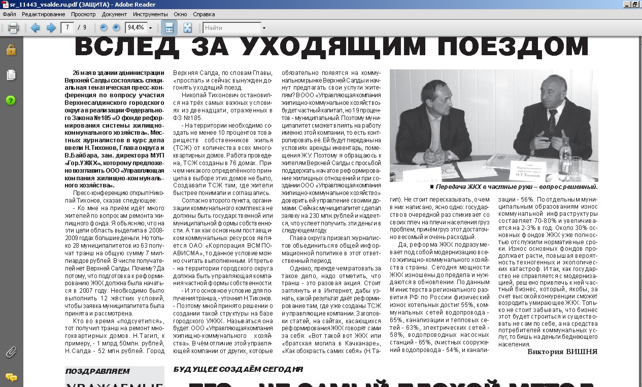 ASN согласен, есть большие минусы и пробелы в организации ТСЖ в старых домах... но, ИМХО, от этого не уйти, рано или поздно все равно это будет. И если просто тупо ни чего не подписывать и ни чего не делать - лучше не будет... может имеет смысл САМИМ заняться обустройством дома и не ждать маны небесной от администрации? У нас ТСЖ создавалось примерно так же - при подписании акта о приемке квартиры подсовывали бумажки и говорили, что "это тоже надо подписать... пустая формальность, подпись ни чего не значит, но надо"). Да, председатель живет в доме. И его можно переизбрать - лишь бы было кем заменить и кто нить пришел бы на собрание проголосовать... А еще нужна инициативная группа жильцов для движухи. Которая будет народ тормошить, пинать и объяснять ему че к чему. У нас все, кто входит в правление ТСЖ (юристы, экономисты, бухгалтера и т.д.) живут в доме - мы их сами ИЗБРАЛИ. Они и были той инициативной группой, которая ходила сначала по квартирам, рассказывала что к чему и почему надо делать так а не иначе. И если они завтра придут и скажут, что им надо поднять вознаграждение за их работу в ТСЖ - я с удовольствием буду доплачивать. Потому что они все делают как для СЕБЯ. На счет управляющей компании - да, в Салде с этим туго... вернее, вообще ни как для примера... в Новоберезовском поселке (рядом с Бургом) в СТАРОЙ 5-ти этажке делается ремонт: замена ВСЕХ трубопроводов в доме на новые (включая подвод от магистрали), ремонт подъездов, крышу перекрыли... в доме ТСЖ всего 2,5 года. САМИ собрали деньги, часть выбили с администрации (под программу ремонта ЖКХ или как она там называется). Провели тендер на ремонт дома, на собрании утвердили фирму и теперь ремонтируются. Бабульки, которые изначально ОЧЕНЬ упирались и не хотели вступать в ТСЖ, теперь нарадоваться не могут - ремонта в доме не было лет 20. Вот такие дела... и таких примеров очень много. Правда очень много и противоположных :(. Это опять же все от жильцов зависит - по возможности надо принимать активное участие в жизни дома и ТСЖ - и все будет Я не хочу ни кого агитировать... просто не надо подписывать не читая :) а если что-то не понятно - лучше разобраться, прежде чем подписывать. А вот если бы авторы этих листовок занялись тем, против чего они агитируют - я думаю, был бы хороший дом |