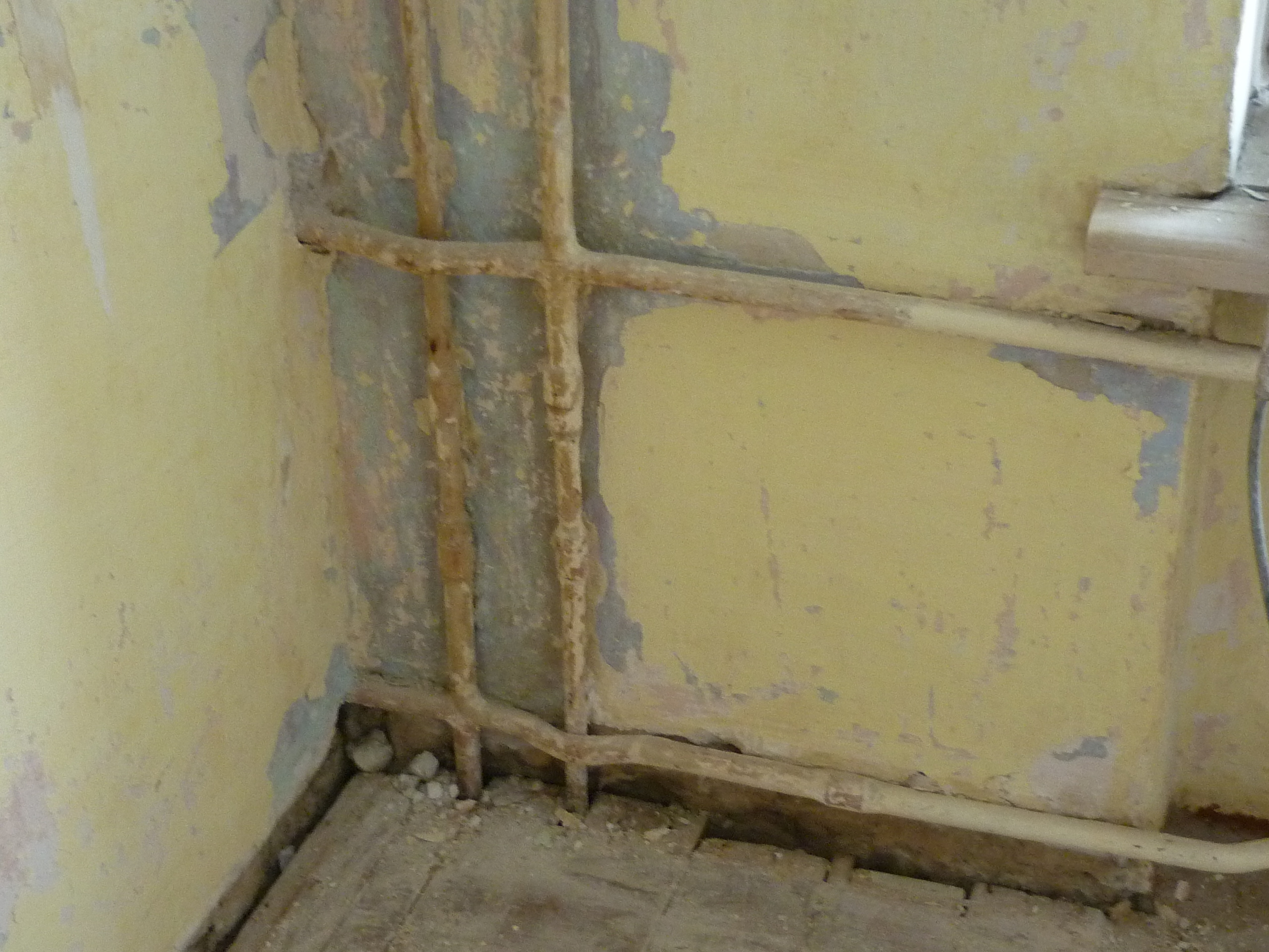 Предварительно на старый потолок смонтировали эл.проводку, в гофре естественно, хвосты с потолка к розеткам и выключателям в штробах. Стояк отопления порадовал, если подача на чердаке имела рабочий вентнль отсечки, то в подвале обратка навевала уныние, к тому же отсутствовал спускник стояка. Как сливать стояк-не понятно. Плюсом к этим неприятностям добавилось и то, что стояк был на две квартиры, т.е. отводы от стояка расходились так называемыми "штанами"-один отвод к тебе в комнату, второй к соседу, да ещё до кучи сосед располагался в соседнем подъезде. Конечно, можно было нарезать резьбу и оставить у соседа металл, но тогда какой смысл замены? Вот они-"штаны". Сообщение отредактировал xloki - 12.12.2015, 1:28 -------------------- If you like pussy, marriage is not for you