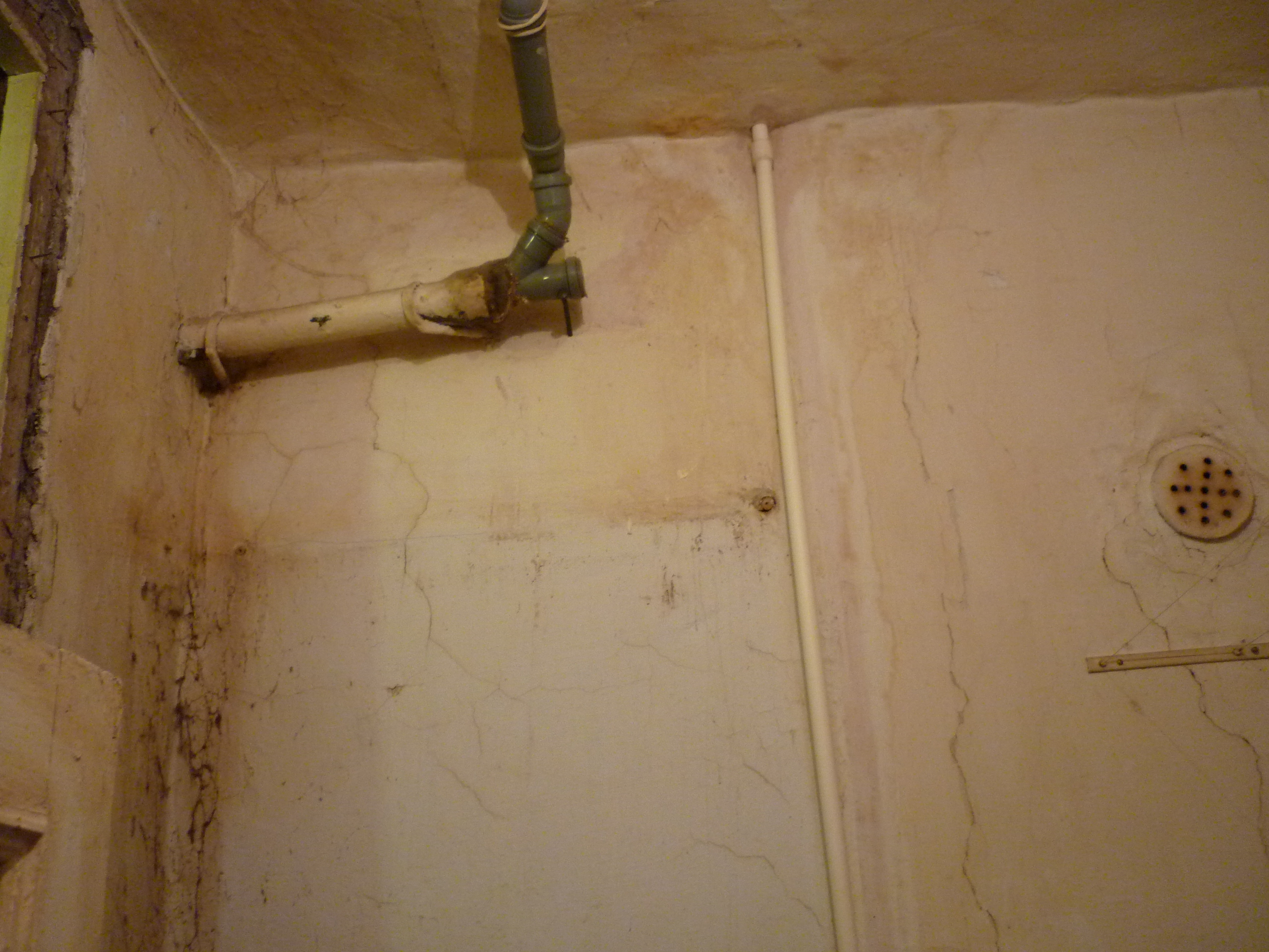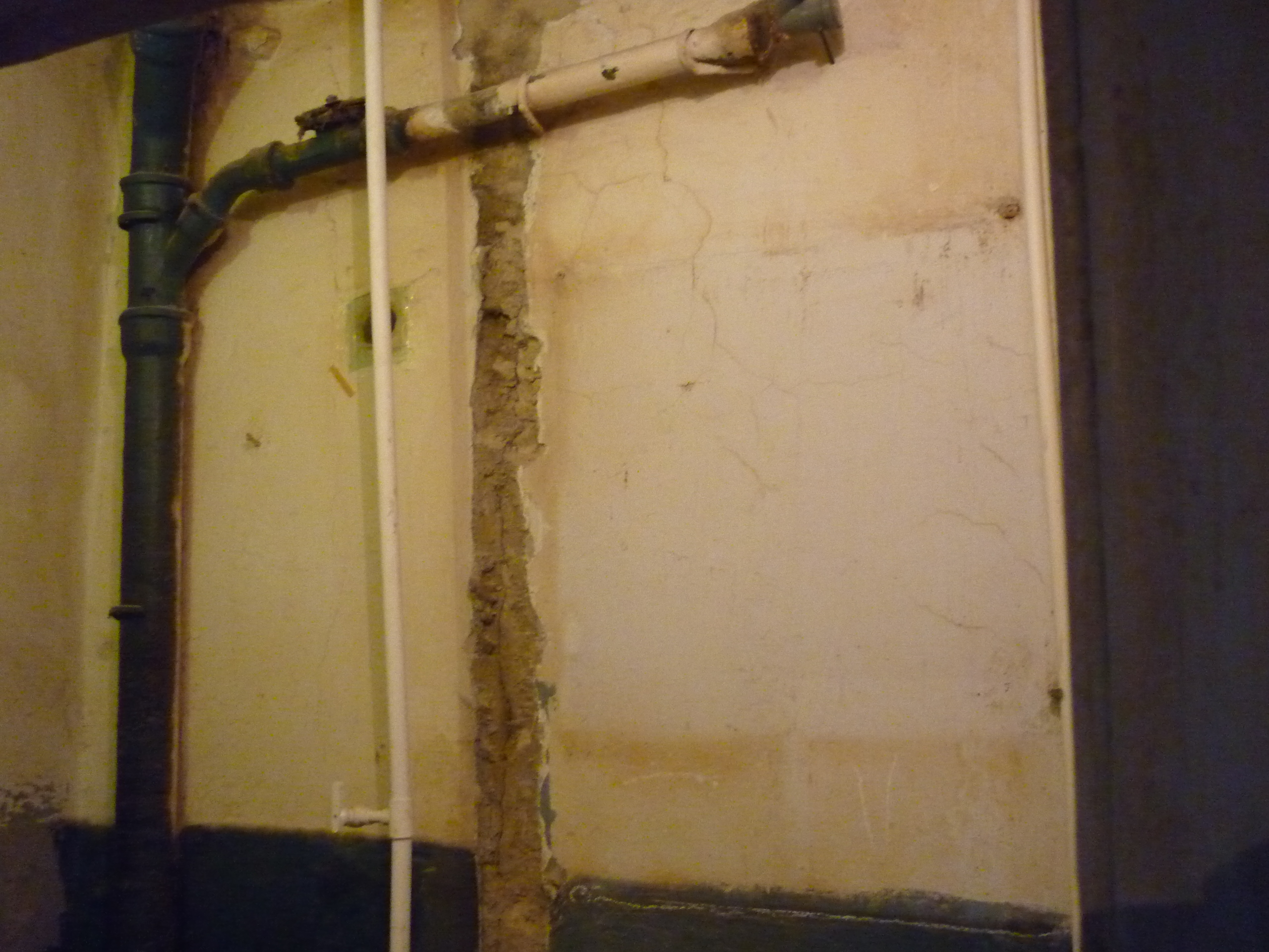 Стенка между ванной и туалетом была кривая, как турецкая сабля Эрдогана, поэтому пришлось её депортировать на помойку. При вскрытии стены обнаружилась её оригинальная конструкция, примерно на метр она была выложена из белого силикатного кирпича, а дальше до потолка сколочена из досок в два слоя под 90 градусов, ну и естественно дранка и штукатурка, в которой похоже цемент вообще не присутствует. Немцы вроде строили, а цемента нет.