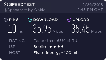 Улиточка, это сарказм. Он же у вас спрашивает по какой технологии подключение. Возможно вы все еще с модемом от телефона или с модемом АДСЛ и не в курсе что нужно совсем другое оборудование для Интернет 120 Мбит/с. Но не надо унывать, если у вас все таки нужный модем и включен постоянно, просто перезапустите его или наберите техподдержку своего провайдера. Отключила Ростелеком, была подключена оптика на роутер вай фай "Асус"!!! На то же оборудование подключила "Сети Тагила" на самой маленькой скорости через вай фай все работает идеально!!! Скорость просто ВАУ!!!! К вай фай подключен 1-ноутбук, 3-телефона и иногда планшетка. http://www.speedtest.net/my-result/4657485778 Сообщение отредактировал Улиточка - 12.9.2015, 16:11 -------------------- Улиточка