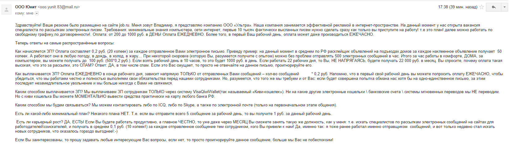 заглянула в свой электронный ящик и обнаружила там подозрительное письмо!!!!! от центрального банка Нигерии!!! написано на плохом русском...просят связаться по вот такому номеру +2347058532043 или ответить письмом!!!! суть письма - якобы мне необходимо получить компенсацию так все страшно стало боюсь......долгов у меня нигде нет может кому приходило подобное??? Почти каждому приходят. деньги раздают. только взнос небольшой нужно оплатить. типо налога. Такие письма сразу В СПАМ. |