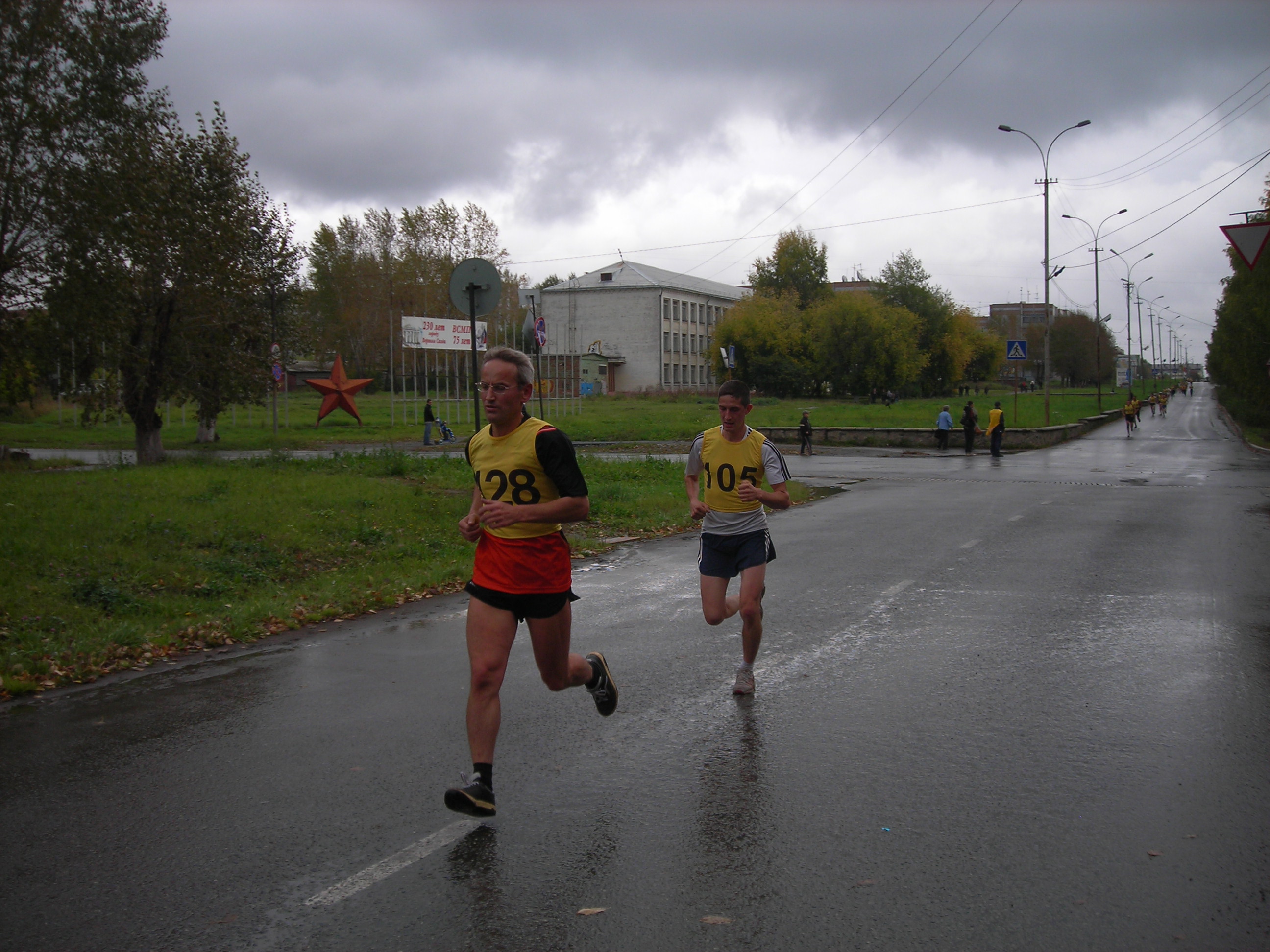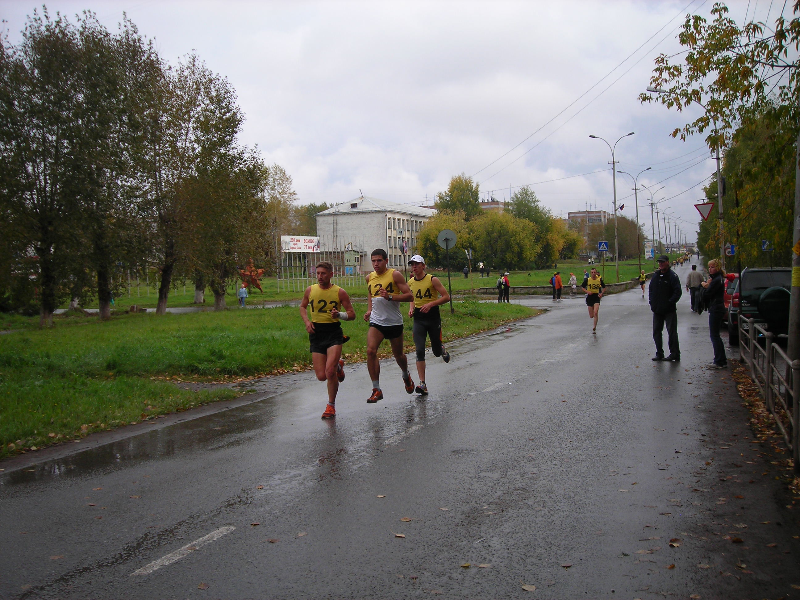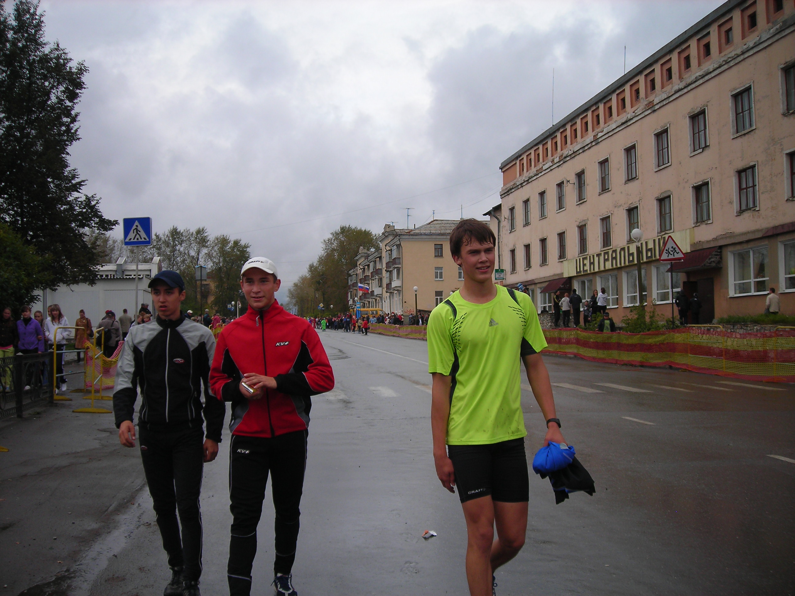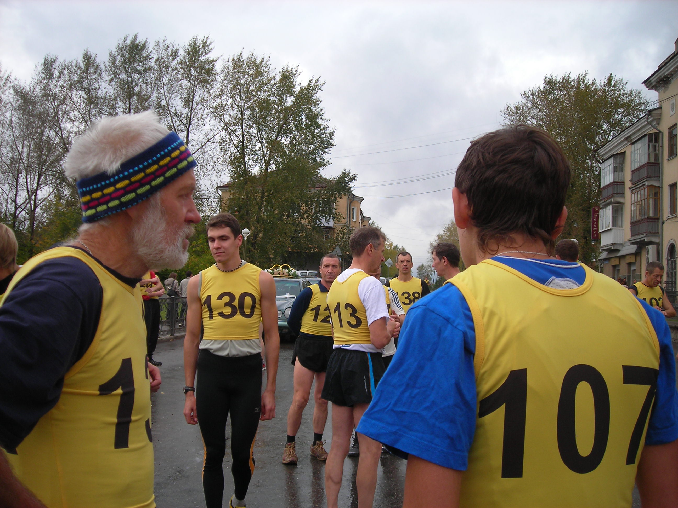 Не было футболок с номерами... не федеральный уровень...? Хуже от этого кросс не стал. Удивляющиеся прохожие, как всегда, переходя дорогу на полусогнутых, делали замечания устроителям:"Чего выгнали людей в дождь?" Среди бегущих, естественно, не было подобных настроений... Кросс удивителен: участвали целыми семьями(семья Рудовых даже в профессиональном), болели целыми классами, милиция и то была из мастеров спорта(Александр Камелин), а ветераны спорта вообще все явились как миленькие(Виктор Стремоусов и компания)... |