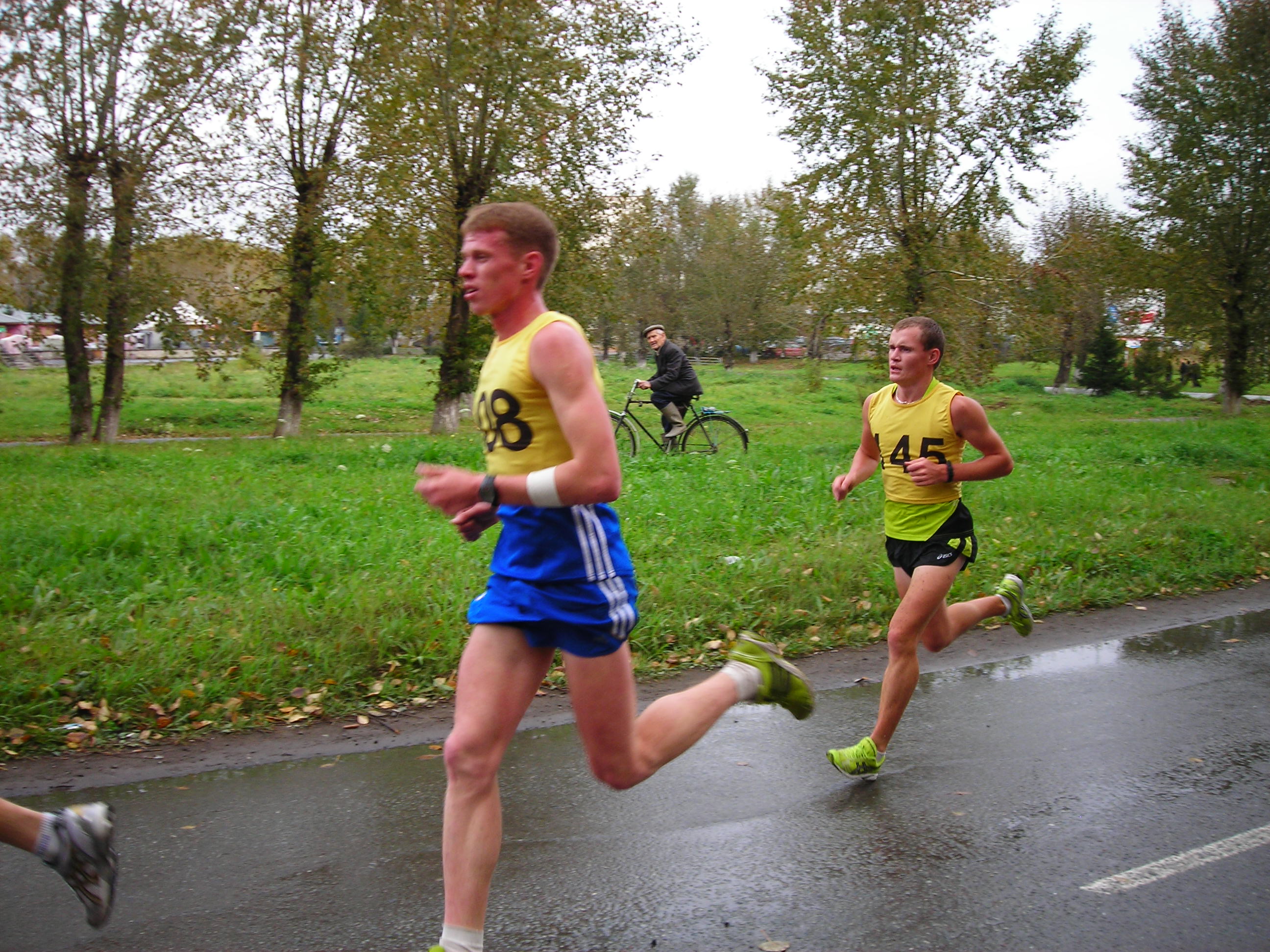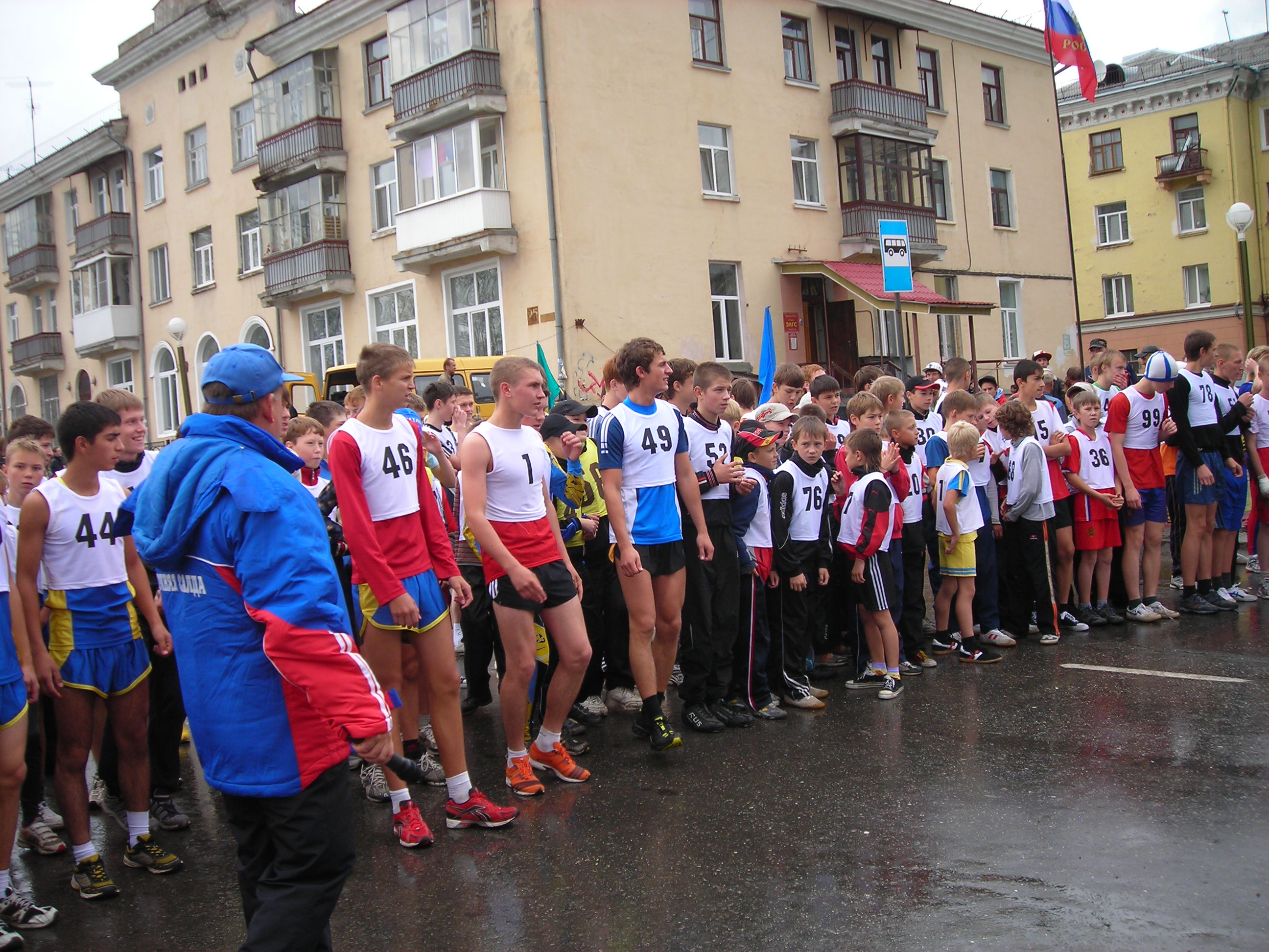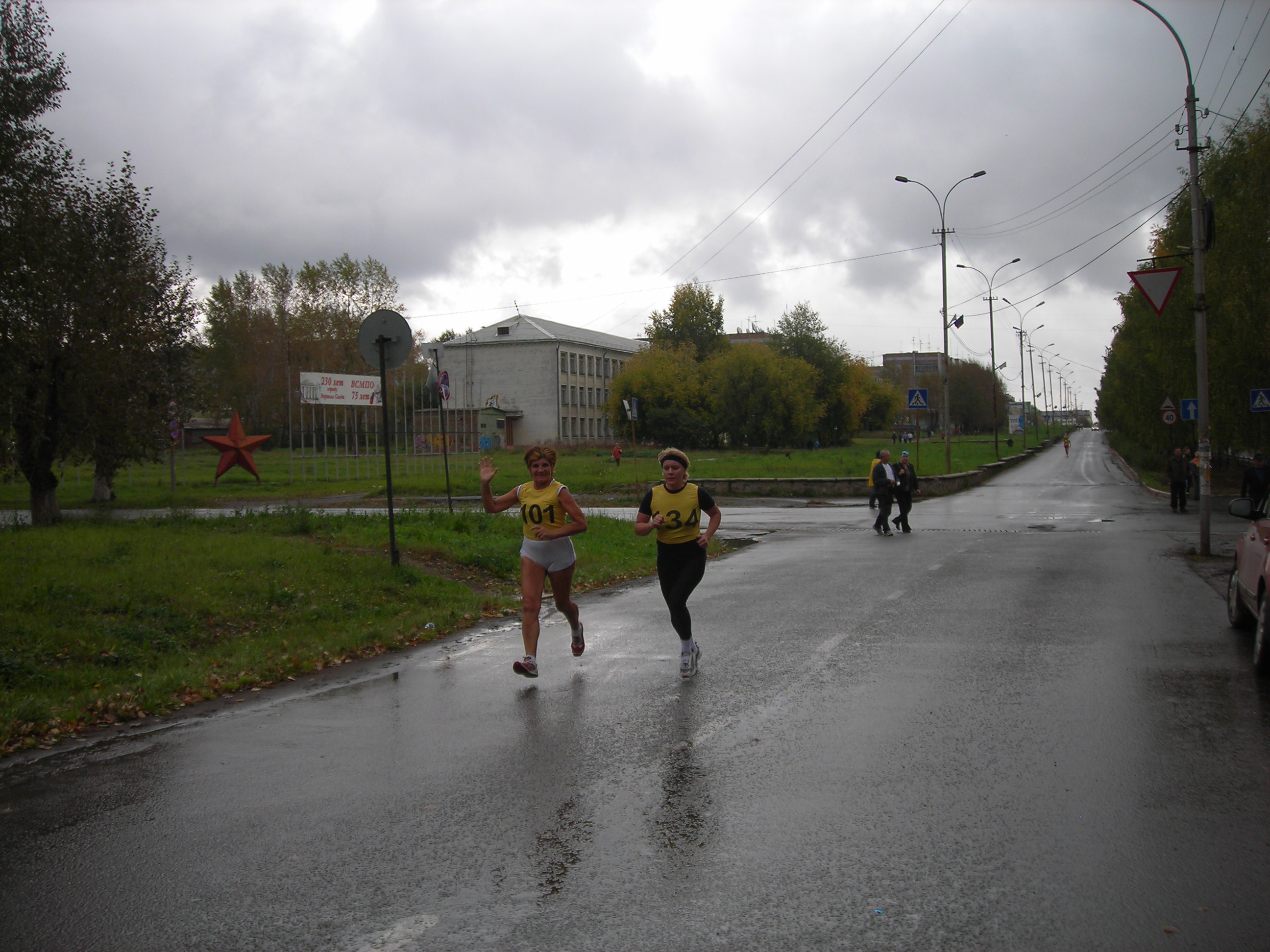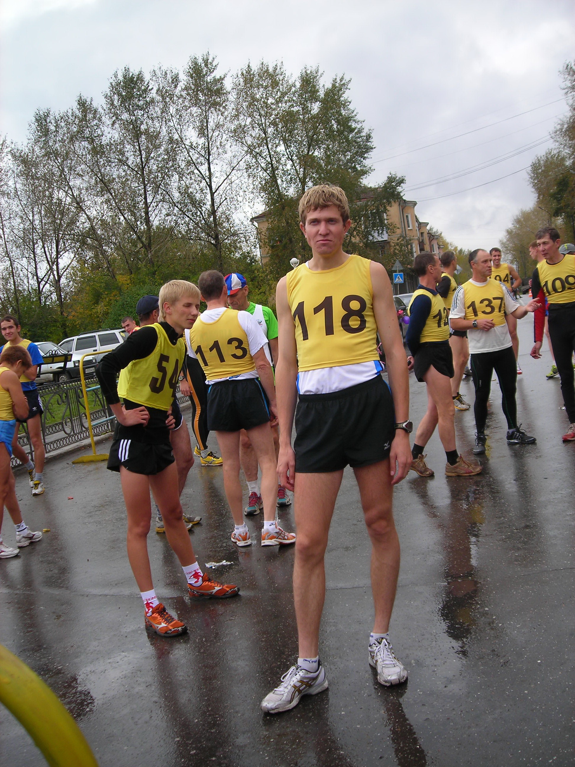 Не было футболок с номерами... не федеральный уровень...? Хуже от этого кросс не стал. Удивляющиеся прохожие, как всегда, переходя дорогу на полусогнутых, делали замечания устроителям:"Чего выгнали людей в дождь?" Среди бегущих, естественно, не было подобных настроений... Кросс удивителен: участвали целыми семьями(семья Рудовых даже в профессиональном), болели целыми классами, милиция и то была из мастеров спорта(Александр Камелин), а ветераны спорта вообще все явились как миленькие(Виктор Стремоусов и компания)... |