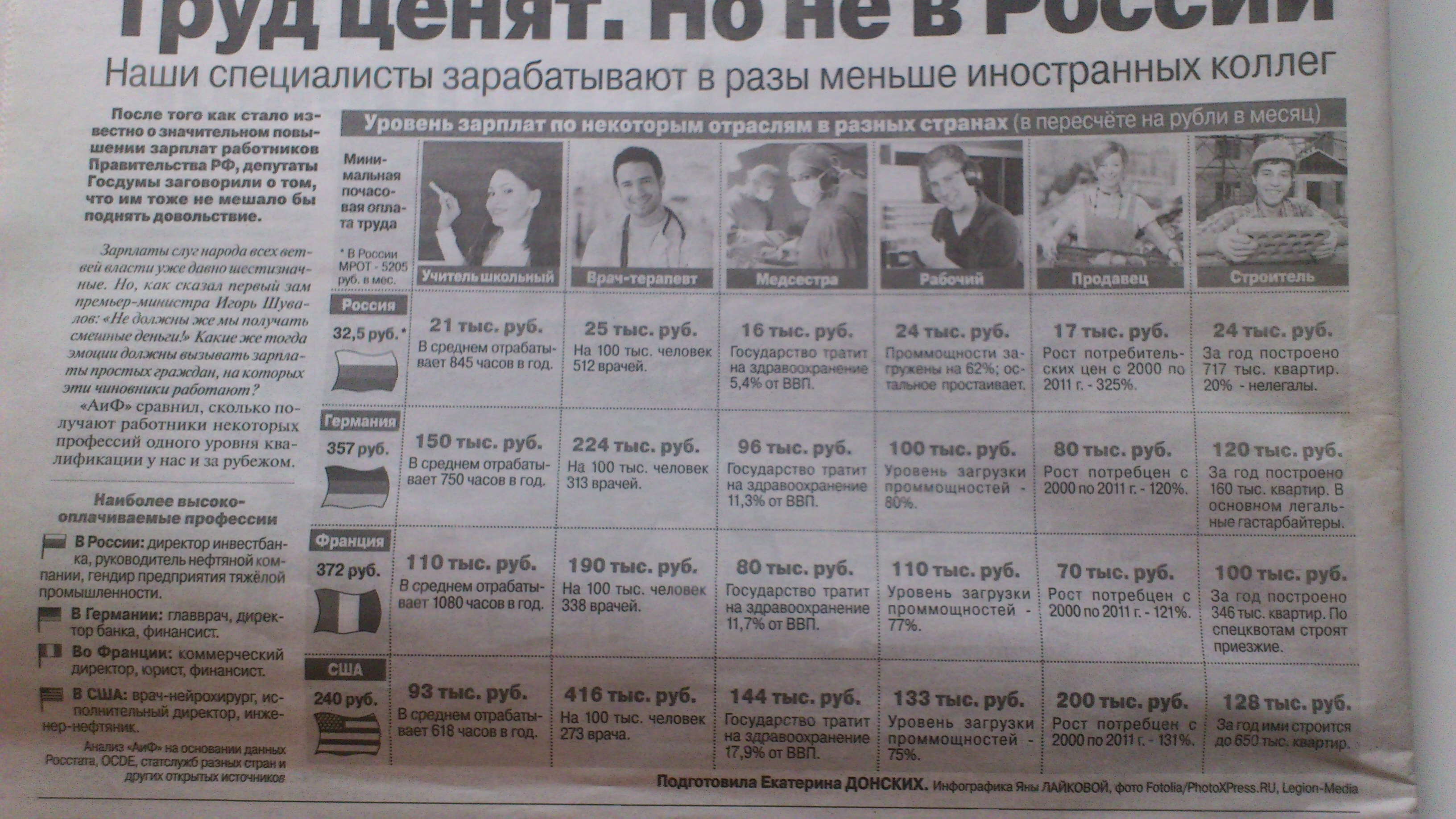 воооот когда наши российские учителя научат наших российских рабочих делать мерседесы боинги айфоны телевизоры утюги мультиварки. строителей строить дома дороги тротуары. врачей лечить. продавцов торговать. учителя здесь нипричем, учителя могут научить только учиться (познавать теорию) а насчет реальной работы... как они могут научить тому, чего сами не умеют? поэтому рабочий должен учиться у рабочего, печник у печника, строитель у строителя, врач у врача и т.д. российских рабочих делать мерседесы боинги айфоны телевизоры утюги мультиварки. а причем тут рабочие?... вообще-то это больше к инженерам относится, а потом уже к рабочим а инженеры нынче не в почете... как впрочем и рабочие, и учителя, и врачи... у нас общество юристов, финансистов, манагеров... это вам не СССР а население цывилизованных(тм) стран будет почитать за честь пользоваться нашими российскими товарами. лечиться у нас... вот тогда мы будем зарабатывать не меньше чем они этого не будет... и этого не могло быть в принципе... нас не для этого подключали к мировой финансовой системы, у нашей страны другая роль и как бы здесь простые люди (не решающие политические вопросы) не крутились... какую бы смекалку не применяли... наш продукт будет всегда неконкурентноспособен! поэтому здесь такие мизерные зарплаты - а какие зарплаты, так люди и работают - на отъяб..сь |