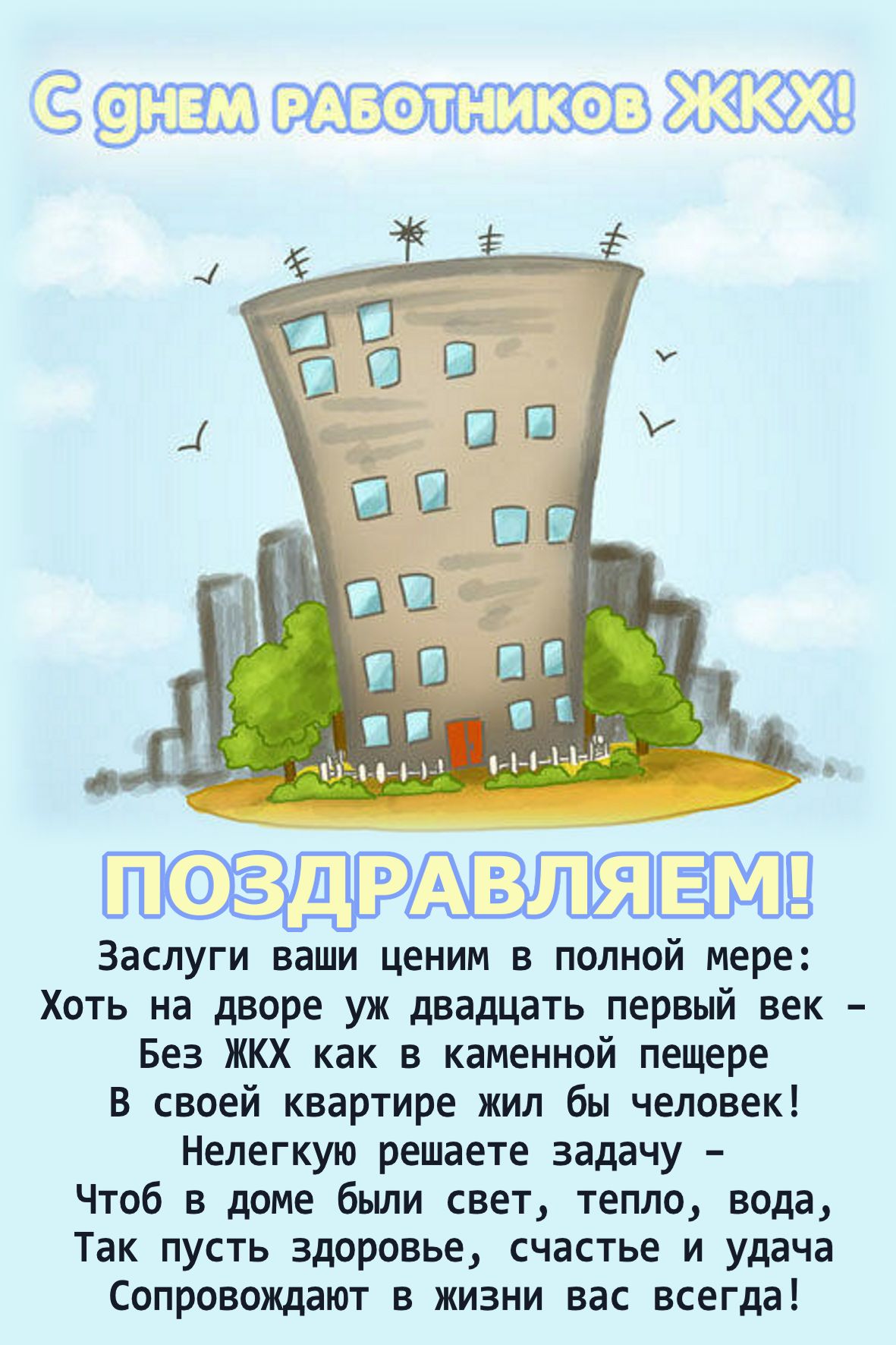 Поздравляю работников УЖКХ с их профессиональным праздником! Желаю успехов в вашем нелегком труде. Пусть ваша работа приносит вам удовлетворение и достаток, а нашему городу и жителям благополучие и порядок. Всего хорошего!