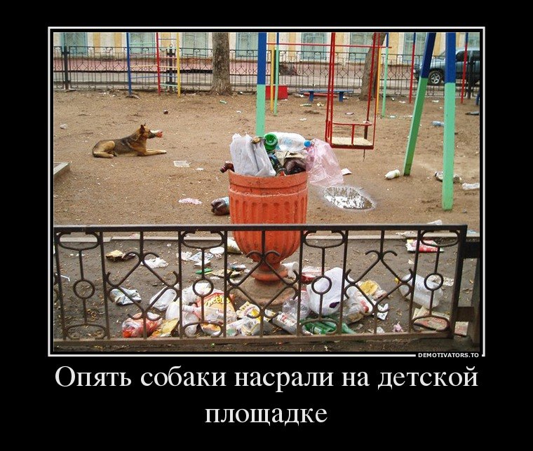 равнозначно - что мусор, что собачье дерьмо неприятно видеть, но фантики-то по весне я убрать могу, а вот г-но нет желания убирать((( ещё больше раздражают битые бутылки - и вот как раз в этом случае имеет значение какая мусорка, всё-таки урны нужны и ещё нужнее, чтобы их вовремя освобождали от мусора. Котофея вот демотиватор закинула, где на детской площадке мусор, а там чётко видно, что не люди свинушки, а работники, отвечающие за уборку мусора, лодыри. пс: люди-свиньи не только на улице гадят - с подъезда начинают, у нас какой-то засранец прямо у подъездной двери мусорный пакет поставил, потом кто-то решил, что это урна и стал туда подкладывать Сообщение отредактировал ТИМ - 5.4.2016, 21:24 |
