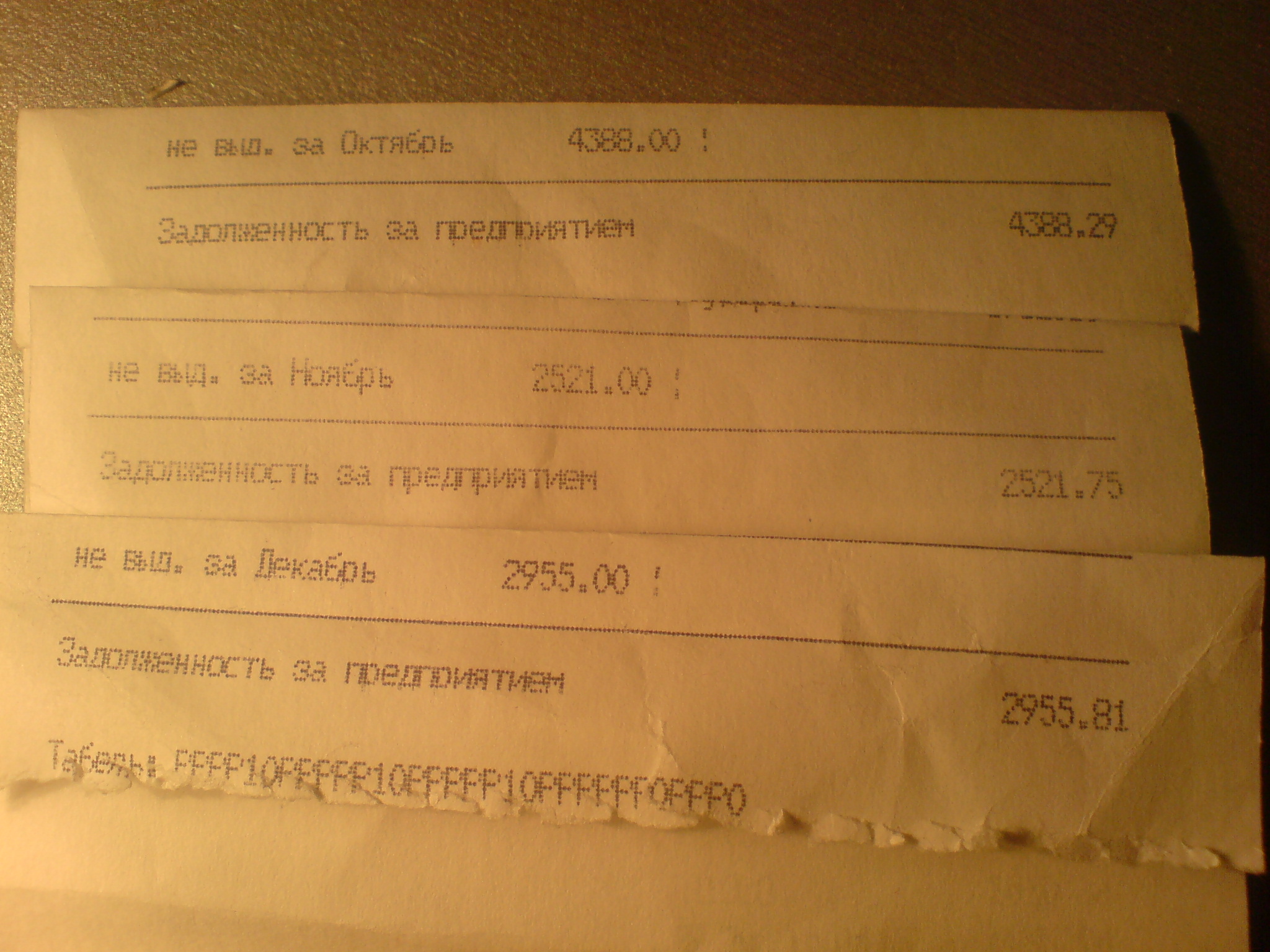 я же говорю там особая политика ,даже в квитках--к ново насчитанным деньгам (по списку:премии,оклад и т.д)зачем то приплюсовываеться предыдущая зарплата .и в итоговой сумме ты видиш не плохое число..но стоит спуститься ниже ,где написано -задолжность за предприятием,там ты не видиш и половины от выше указанной суммы Нужно циферки внимательно смотреть, а по всем вопросам обращайтесь в бухгалтерию (к. 216), там все объяснят (никого еще не посылали). |