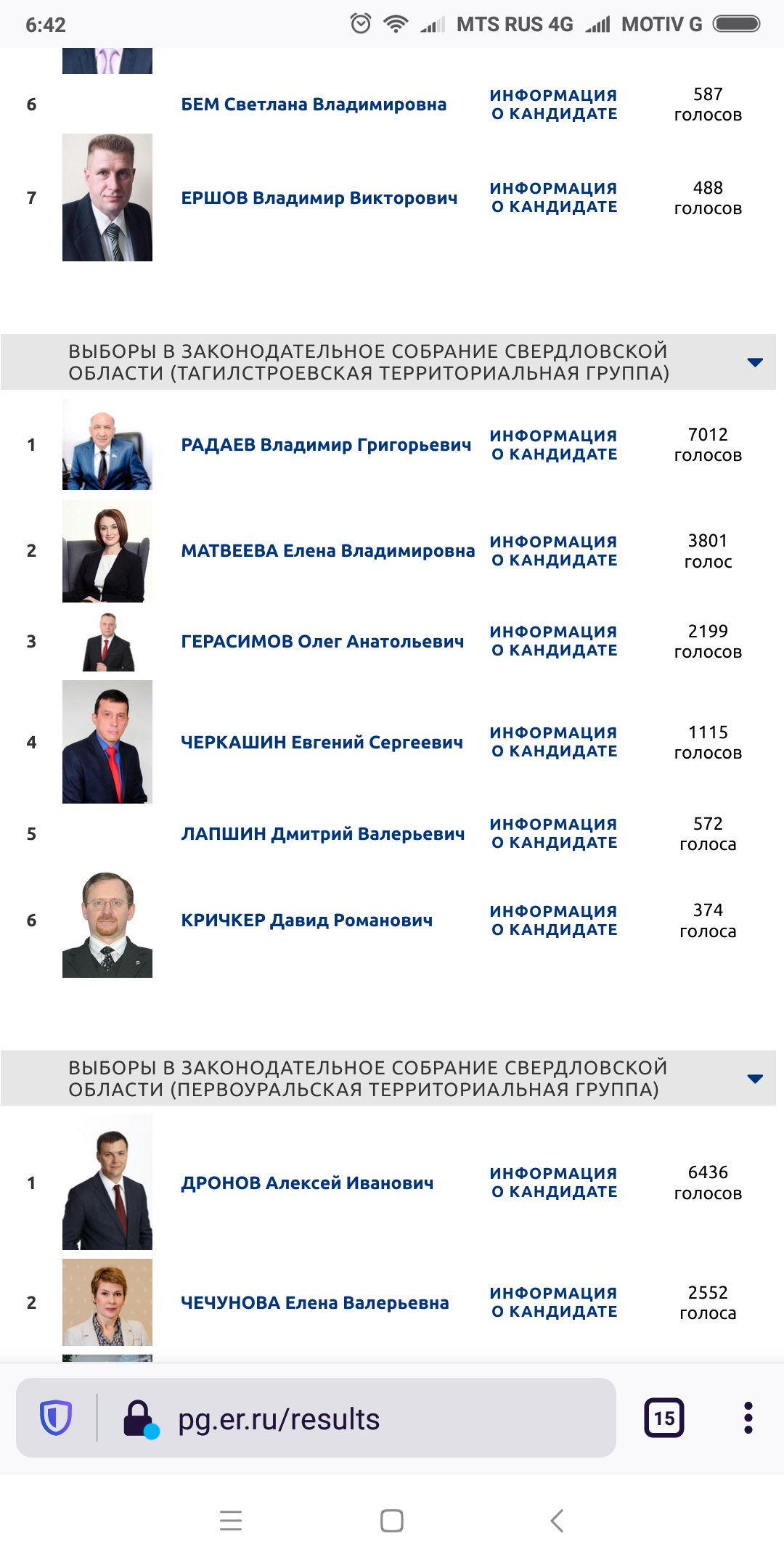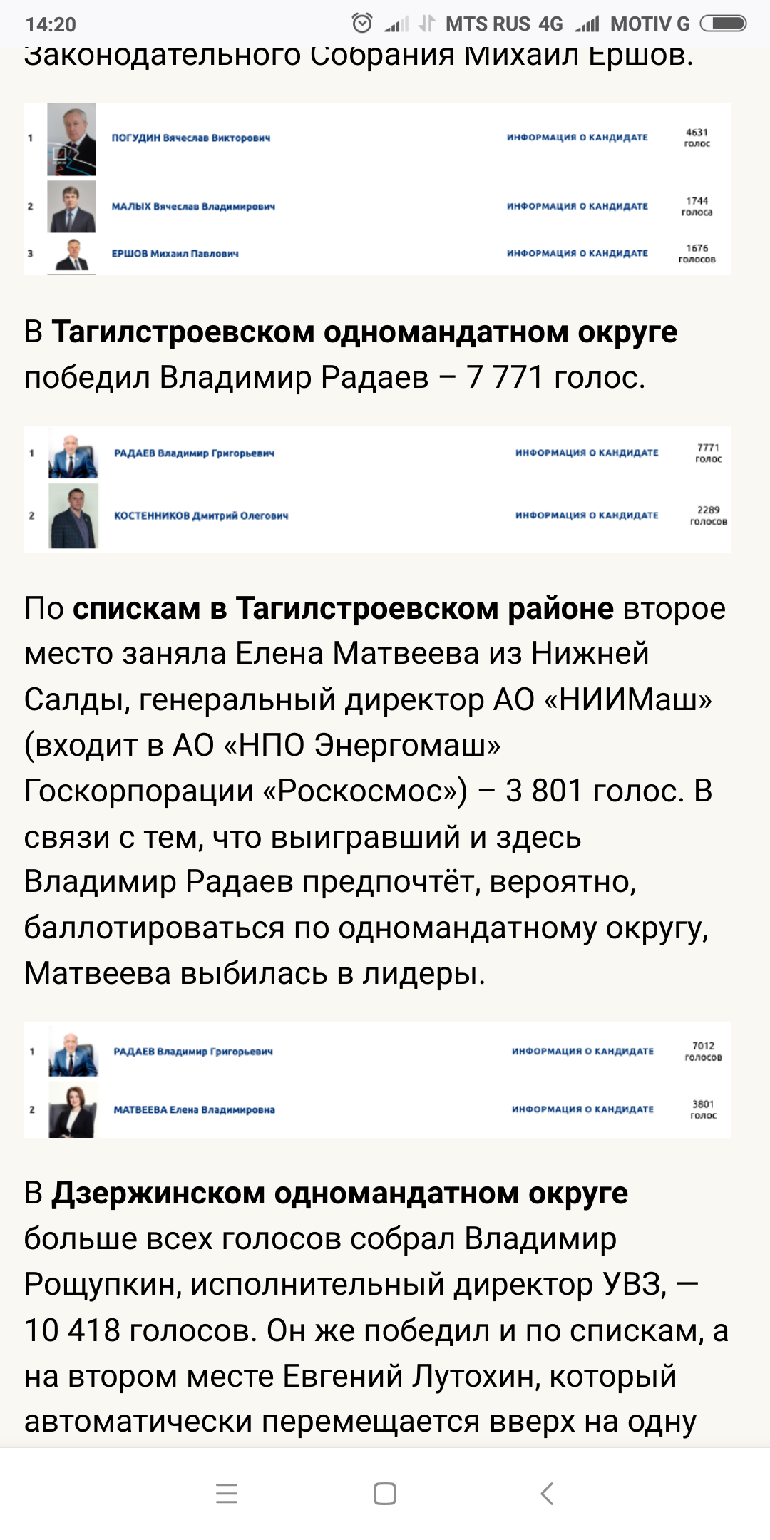 Ну что товарищи, второе место в группе Ну так это понятно было изначально. Надо было от Нижней Салды идти А что тут хитрого? По-моему это глупо. Кто её в Тагиле знает? Ежу понятно, что в Тагиле Радаев победит, тагильчане его хорошо знают. Пошла бы в Салде по одномандатному округу, были бы шансы избраться.