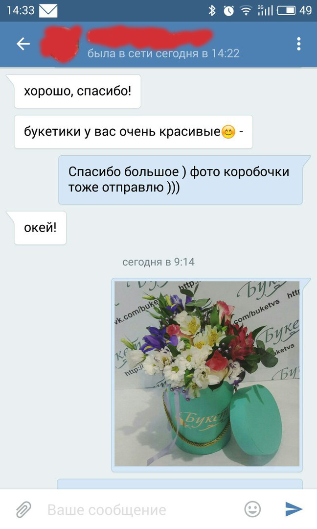 Добрый день ))) Раз уж девушка не особо горит желанием прикладывать фото шляпной коробочки ( которая была заказана) , то это сделаем мы. Т.к. за свои работы и качество цветов мы несем ответственность. И на заказы мы всегда ставим свежий цветок, т.к. портить репутацию магазина из-за одной композиции нам нет никакого смысла. Стоимость коробочки 1100 из них 640 рублей коробочка 460 рублей композиция. Стоимость коробочки мы предложили вернуть , а стоимость доставки ( т.к. она была выполнена) и стоимость цветов т.к. они были обрезаны под композицию ( состав которой был обговорен с девушкой) вернуть мы не можем. т.к. претензии по качеству цветов не обоснованы ( накладные по поставке цветов с датами тоже имеются ) весь цветок был поставлен в магазин 20.09. о чем тоже было написано. Так же фото коробочки было отправлено заказчику. Сообщение отредактировал BUKETVS - 21.9.2016, 15:03 |