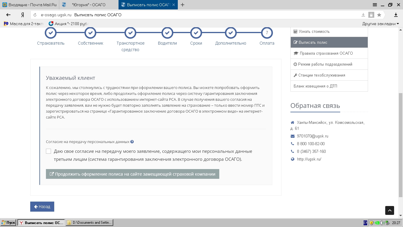 Так если Вы клиент гайде почему бы вам к ним в офис не зайти? Заехал к ним на прошлой неделе, записали по времени на следующий день. Приехал, оформили без допов с кбм 0.5! Еще и личный кабинет завели. Единственное полис сделали электронный, не на оригинальном бланке, но мне это не принципиально. Деза! У двух агентов просил, только с допом от 1000 руб. и до 40% от стоимости ОСАГО! Зашел в офис, там с ходу предложили запись, но уточнили что только с допом так же от 1000 руб. Электронный полис ни одна контора не пропускает, перенаправляет на РСА, тот предложил уже 3-ю СК - ВСК, плюнул, зарегился у них, все прошло гладко, полис и квитанция оплаты прилетели на мыло. Жалобу на ГАЙДЕ все равно отправил в ЦБ, хоть и откажут ввиду отсутствия видеофиксации. За прошедший месяц отослал жалобы на РСА и на все страховые, пусть отписываются! Будет че повыше отправить по случаю. |