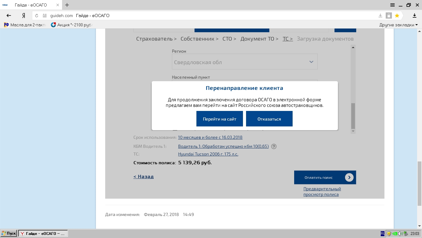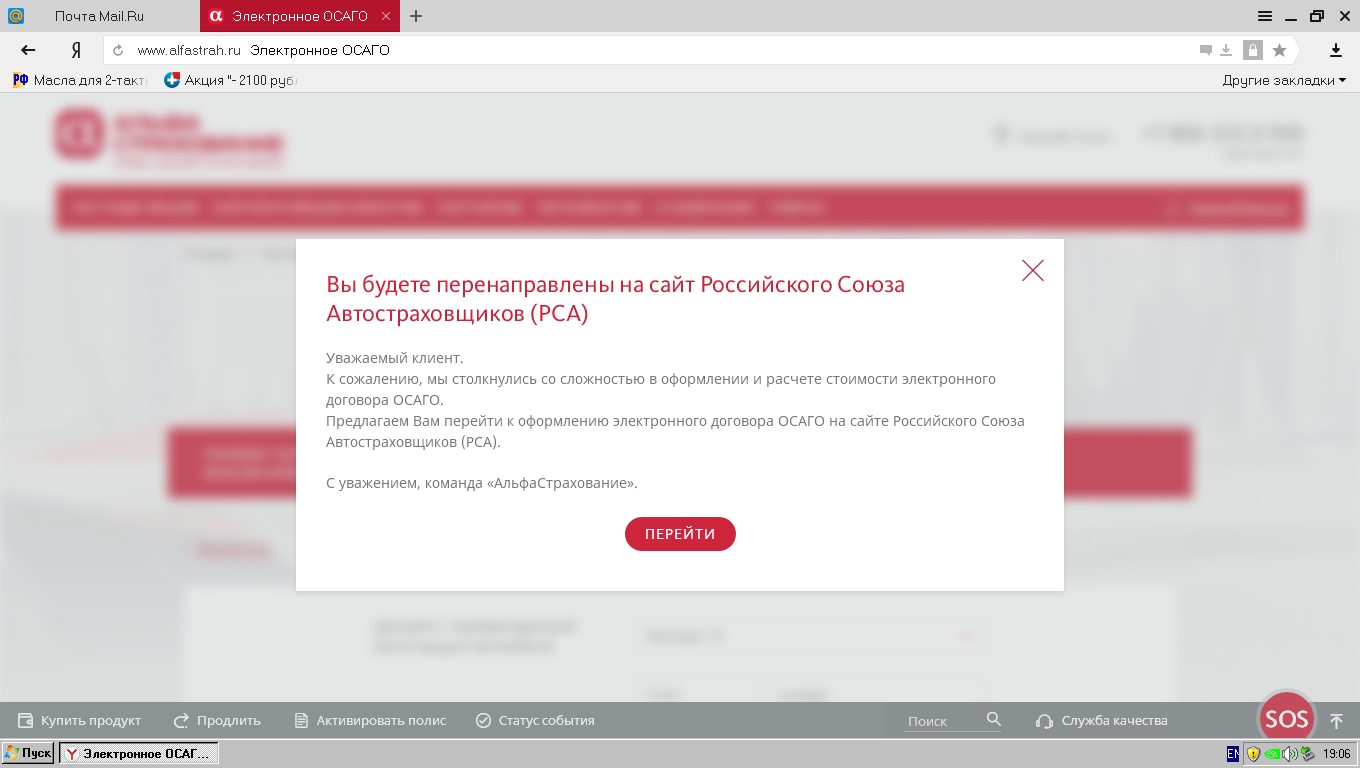 Деза! У двух агентов просил, только с допом от 1000 руб. и до 40% от стоимости ОСАГО! Зашел в офис, там с ходу предложили запись, но уточнили что только с допом так же от 1000 руб. Электронный полис ни одна контора не пропускает, перенаправляет на РСА, тот предложил уже 3-ю СК - ВСК, плюнул, зарегился у них, все прошло гладко, полис и квитанция оплаты прилетели на мыло. Жалобу на ГАЙДЕ все равно отправил в ЦБ, хоть и откажут ввиду отсутствия видеофиксации. За прошедший месяц отослал жалобы на РСА и на все страховые, пусть отписываются! Будет че повыше отправить по случаю. Второй день не можем оформить полис онлайн, то ошибку с то выдает, то перенаправляет на РСА. |