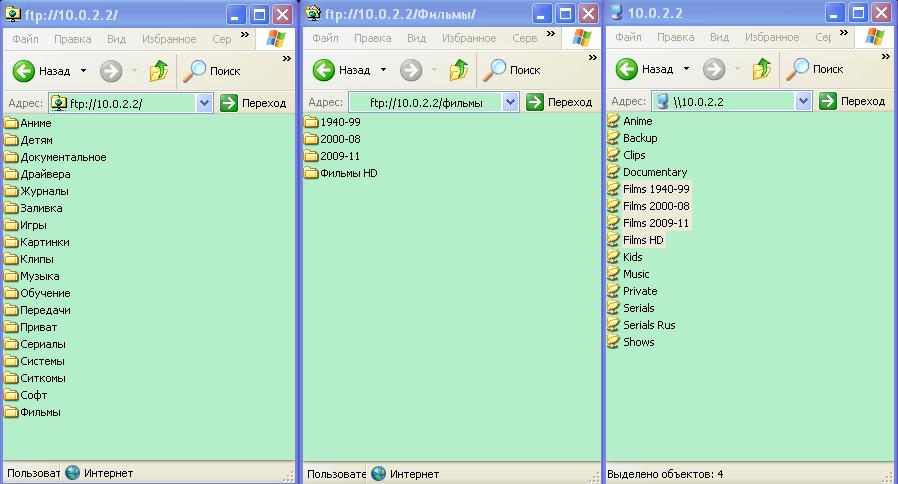 вообщето и обменник и видеосервер на одном ипе висят, и вообщем это все одно и тоже, просто обменник работает через ftp а видеосервер просто расшаренная папка.. лан, для особоодаренных. вот скриншот на скрине 3 каталога. смотри на пути. комп один первый каталог открыт просто ftp://10.0.2.2 второй каталог открыто тот же ftp://10.0.2.2 тока еще подкаталог фильмы. третий каталог это типо "видеосервер" открыто через \\10.0.2.2 надеюсь дошло. а ты качаешь через инетовский адрес. паэтому у тебя и долго. |