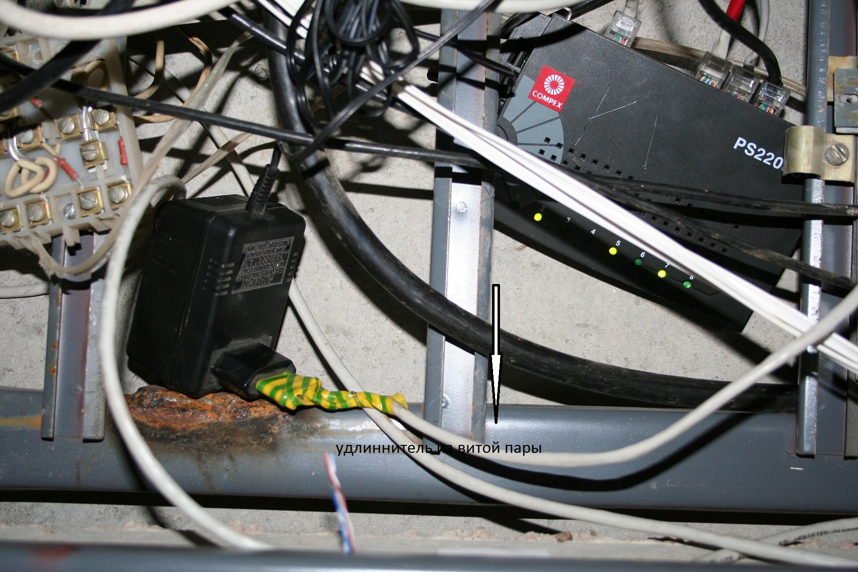 Честно говоря первое впечатление после увиденного - ..шок.. Ведь надо же было додуматься по витой паре тянуть 220.. Провода изрезаны, измотаны, безобразно скручены, свичи висят вообще просто непонятно как.. Просто безобразное исполнение! Это еще божеский вид, было гораздо хуже! (прибрал, затолкал за перекладину, а то все висело на проводах) -------------------- Главным недостатком интернета является то, что он позволил идиотам общаться с нормальными людьми...(С)