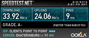 А почему такие большие пинги??? Причем замер делался на компе, подключенном по Wi-Fi , расстояние между точками примерно километр... Тариф 8 Мбит, провайдер Оптилайн ... -------------------- Главным недостатком интернета является то, что он позволил идиотам общаться с нормальными людьми...(С)