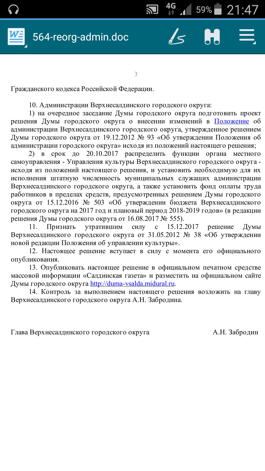 Добрый вечер! Прочитал "Салдинской газету" 48 от 30.11.17 года на 2 странице опубликовали Решение Думы ВСГО 25 от 15.11.17 г. "Об отмене Решение Думы 564 от 31.08.17 г. "О реорганизации администрации ВСГО". Мне кажется всем уже без разницы. Так же как и на то, например, чем там "управляет" управление образования и существует ли оно на самом деле. Или, например, где расположено управление культуры. И действительно ли данные учреждения умеют отношения к культуре и образованию. Предвыборный туман развеялся. Шумиха прошла. |