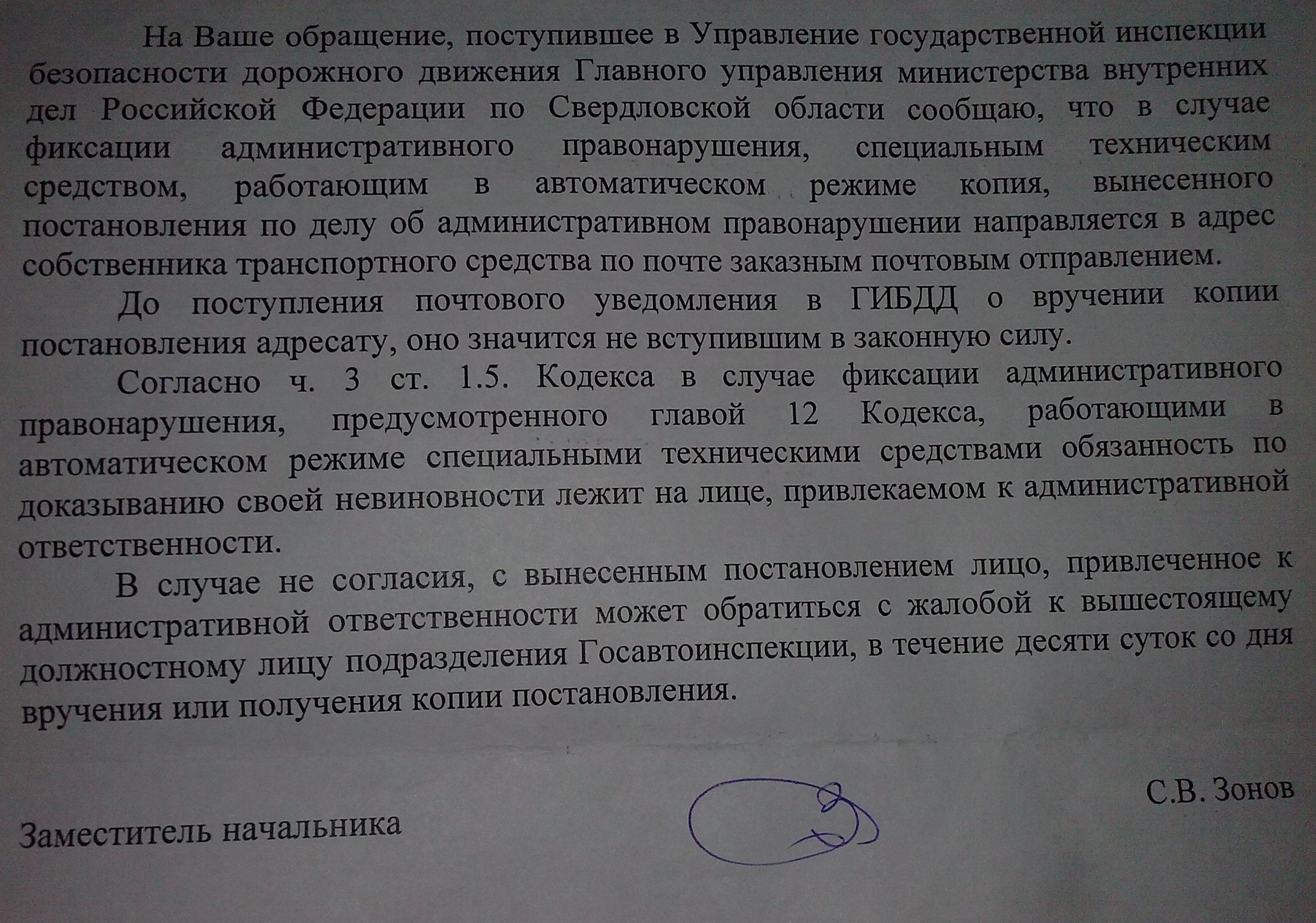 Цитата(strannik @ 13.3.2013, 23:42) Андрей Васильевич, через госуслуги отображается штраф от 04.01.2013, по состоянию на сегодняшний день штраф по почте получен не был, прошу подсказать как быть в такой ситуации? Варианта два. Либо оплатить , либо ждать по почте постановления. Вот ответ из Главного управления МВД РФ по Свердловской области PS: прошу прощения за качество, сканера просто нет :( -------------------- |
