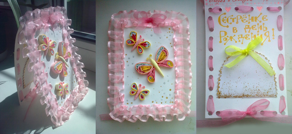Молодец, Ладуся, правильно думаешь и делаешь правильно! Это и есть творчество, когда все продумано и сделано своими руками, а не шаблонно из полуфабрикатов. Учу тому же свою дочку) Даже из полуфабрикатов, как вы говорите работы абсолютно разные просто техники разные, тут квиллинг предствлен, согласна он более трудоемкий, но каждому своё. Я тоже квилинг пробовала, ну не мое это. для интереса сравните любые открытки из п/ф разница есть Работы у девушки красивые и интересные!  |