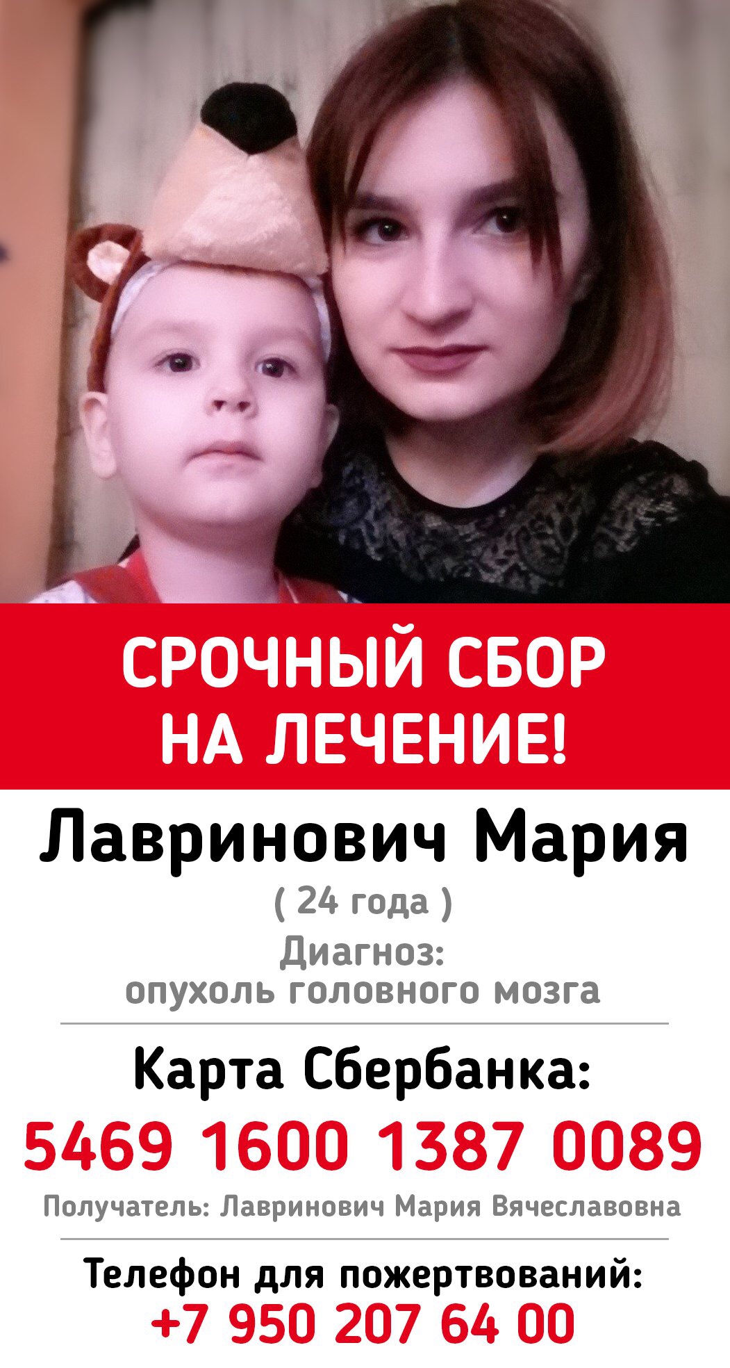 Друзья, знакомые и просто хорошие люди давайте поможем прекрасной девушке, а в первую очередь молодой маме и жене. Люди не останьтесь безучастными, пожалуйста помоги кто сколько может, любая отправленная Вами сумма это шанс на скорейшее выздоровление... Требуется материальная помощь Лавринович Марии Вячеславовне 1993г.р. жительнице Верхней Салды. В январе 2018г. была проведена операция по удалению опухоли, необходимо продолжение лечения в клинике г. Санкт-Петербурга с последующей операцией. Пациенту показано проведение радиохирургического лечения на аппарате Кибер-Нож. Будем благодарны за любую помощь!!!! |