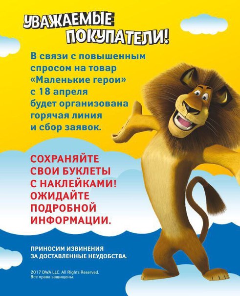 Информация от организаторов акции: ( звонили на горячую линию ) Поставка товаров в регионы в рамках акции 'Маленькие герои ищут друзей' временно прекращена, т.к. готовится новая партия игрушек. В ближайшие дни ожидается отправка товара в достаточном количестве. Каждый участник акции гарантировано сможет приобрести желаемую игрушку ! |