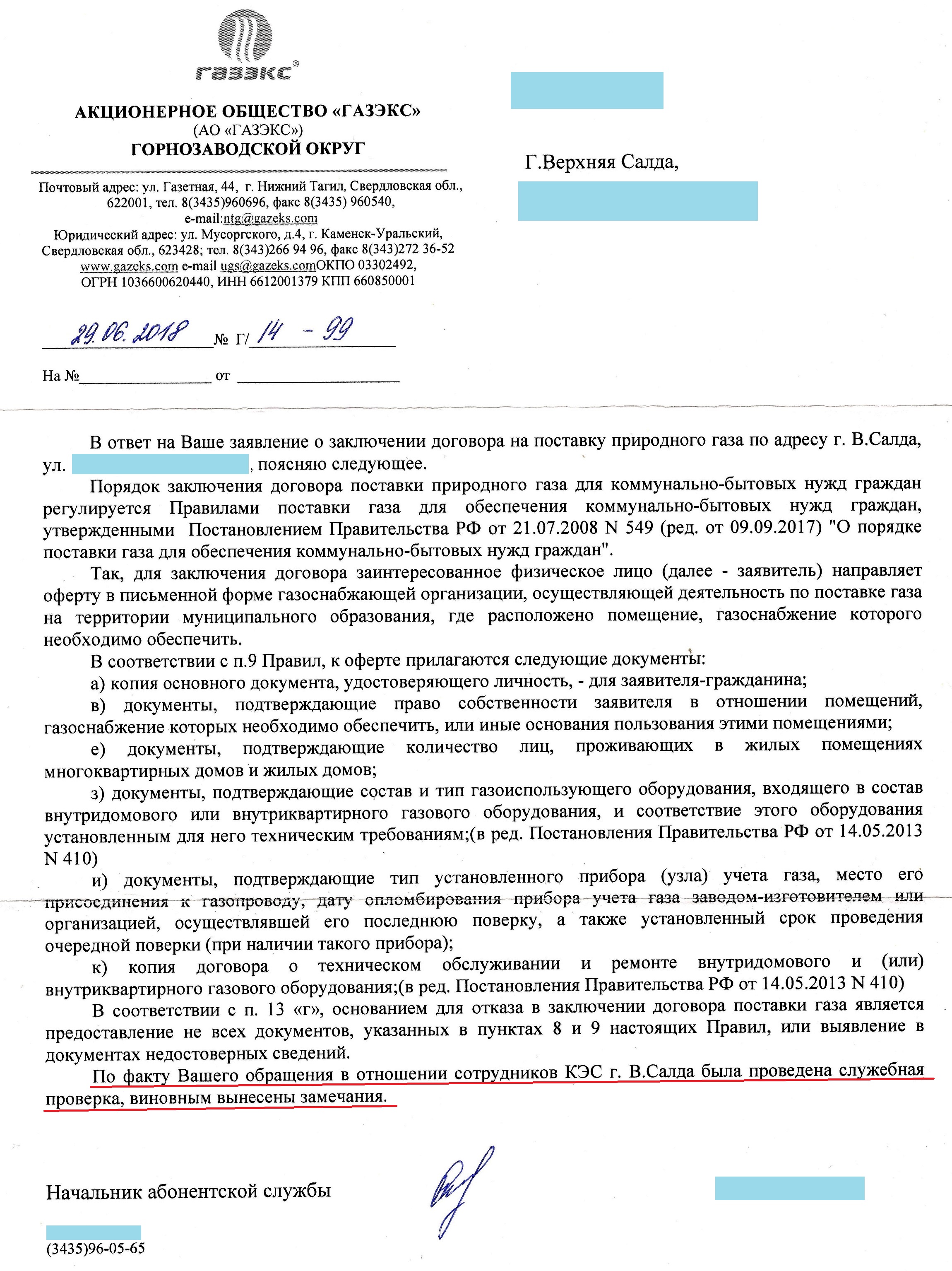 Всем доброго... Ну, все-таки головная контора ответ прислала. (см. вложение) Много воды, но вроде, - "...проведена проверка, вынесены замечания..." Че-т непонятно про отсутствие договора обслуживания как основание для отказа в заключении договора на обслуживание. Какой-то хренов круг замкнутый. Ну, надо выбрать время, взять опять справку о прописке и, - еще одну вылазку в ГАЗЭКС. ))) -------------------- "Нельзя стать узким специалистом, не став, в строгом смысле, болваном."