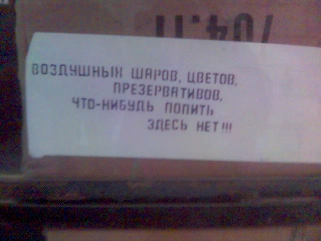 Что то может не в тему, но меня прикольнуло и я сфоткал))) Снимок сделан в центре города Орёл, за кинотеатром "Окрябрь" (Табличка) Надпись в подземном переходе на ларьке с DVD дисками (Лист на окне) Надпись в подъезде г. Н-Салда))) (Лист на щитке) Фото в магазине на ценнике в строке "наименование товара" (Момент-клей) Вход в Ночной клуб "RESPECT" г. Орёл (Знак) Фото сделано в м-не NIX г. Орёл, игра только вышла (Диск+2Гб оперативы...комплект))) Юмор Мед.Фака. (Черепушка) Фото Престижного ночного клуба "Xenon" г. Орёл (Трактор у входа) Балванка м-н Nix (Албанский диск) М-н Nix (Комп для проверки, тестирования отдельных комплектующих) М-н Nix (Почти фирменный чайник) Г.Орёл. окраина города.(Женское нижнее бельё, на палке, через дорогу от гипермаркет "Юнмарт") М-н Nix (Сервер тех. отдела) Сообщение отредактировал Мобильный взломщик - 28.3.2009, 6:20 -------------------- Дети! Не трогайте мокрыми руками оголённые провода! Они от этого ржавеют и портятся!