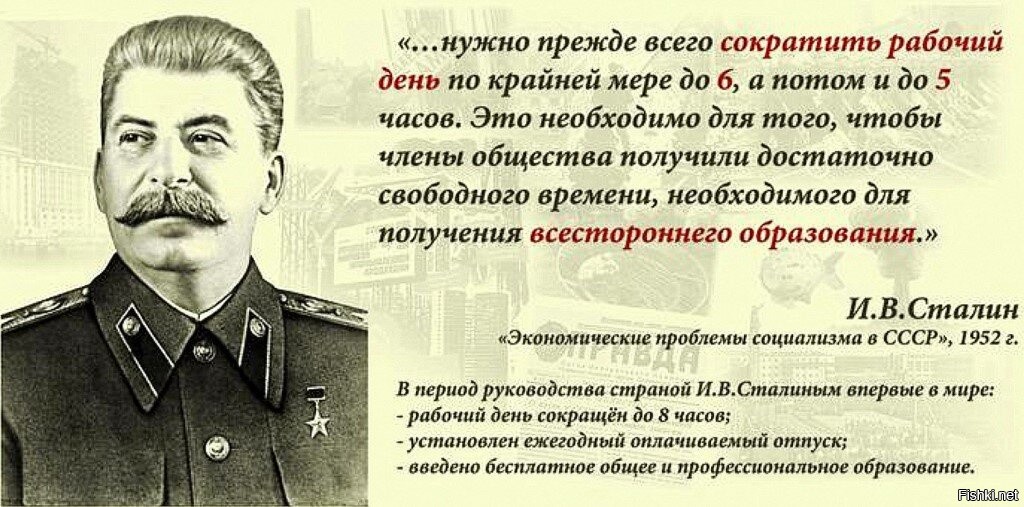 Какая зарплата будет при 5-тичасовом рабочем дне? Ведь всё упирается в производительность труда. Сколько произвёл продукции, столько и получил. Никуда от этой зависимости не деться, деньги не из воздуха берутся, а являются эквивалентом товара. Я думаю, что вообще надо дать право самим работникам определять продолжительность своего рабочего дня: хочет работник подзаработать побольше денег, пусть работает хоть по 15 часов без выходных. А если работнику нужно больше свободного времени (например при строительстве дома), то можно было бы разрешить работать ему по 4 часа (конечно, с соответствующей зарплатой). Хотящих "подзаработать" "по 15 часов без выходных" - очень быстро ждет кладбище. За 8-часовой рабочий день боролись не просто так. 8 часов - работа, 8 часов - отдых, 8 часов - сон. У нас и так мужики до пенсии не доживают, а Вы их хотите совсем угробить. |