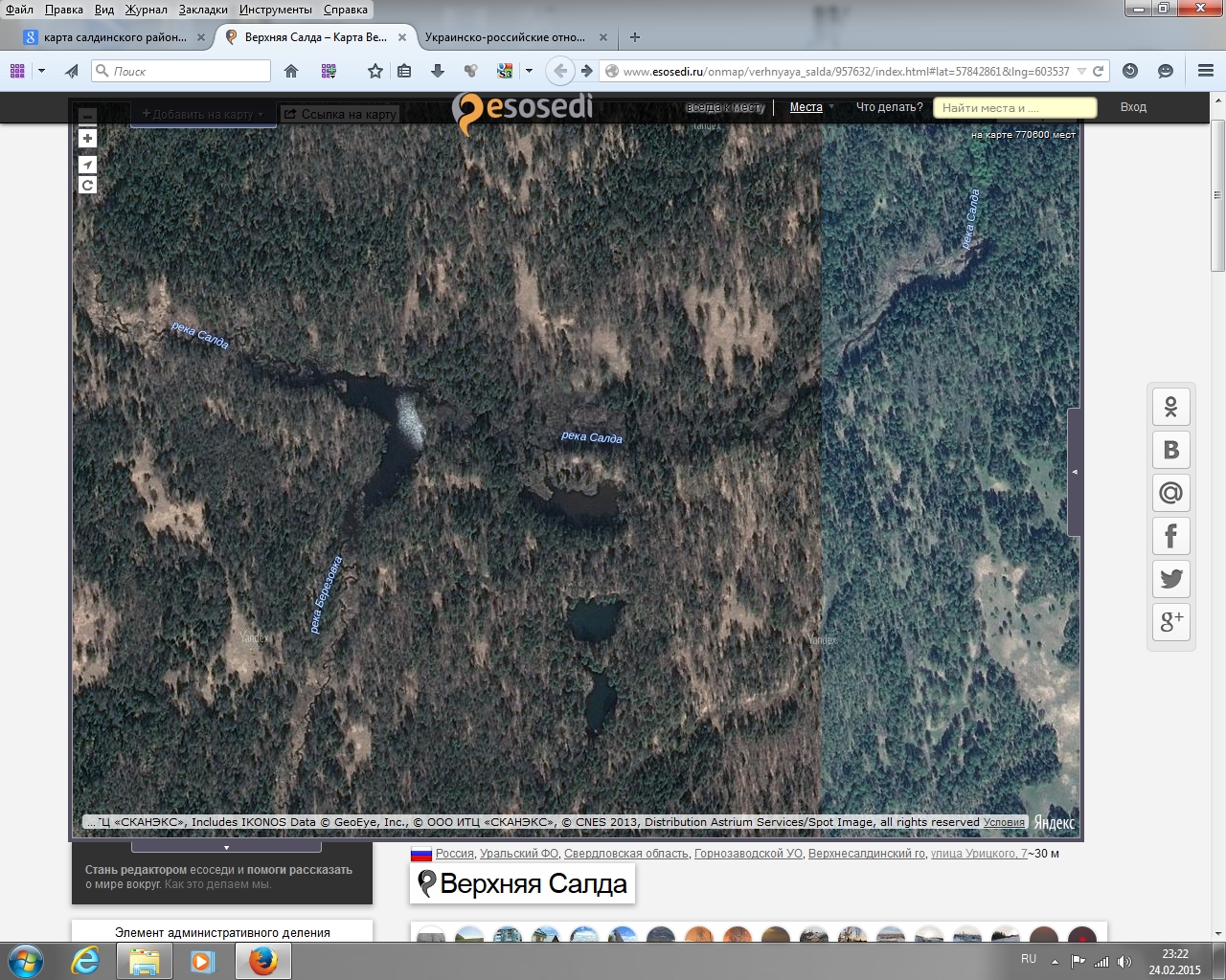 Берёзовка, находится в самых верховьях Салды, недалеко от полигона. Впадает с юга в небольшой, изогнутый в виде бумеранга прудик, через который протекает река Салда. Устье находится примерно посредине, между Никитино и Шиловкой. (57°50'35.46"С; 60°20'59.86"В). Спасибо! Хоть какая-то информация. Кстати, сама Салда река в том районе протекает по территории полигона. -------------------- |