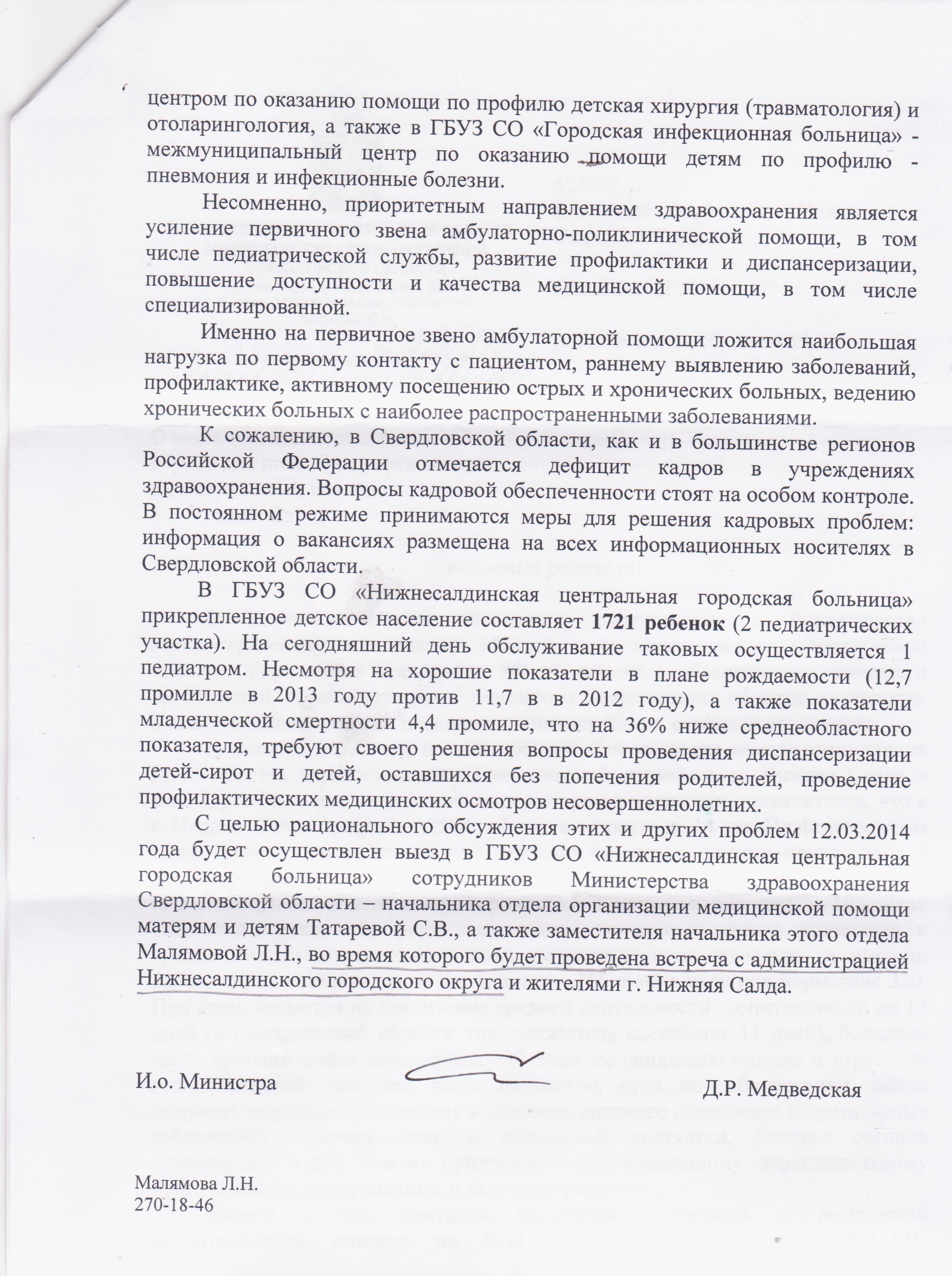 Елена Владимировна, Вам не к лицу лукавить, о комиссии знали многие в том числе рядовые работники больницы. Мы живем в маленьком городе в котором трудно скрыть правду, даже если очень хочется. А то что у Вас непревзойденное красноречие и дар убеждения, которые помогают вам вывернуться из любой ситуации, я думаю поняли уже многие посетители данной темы форума И чтобы не быть голословной прилагаю скан письма из министерства, где говориться о том, что во время приезда комиссии встреча с администрацией города была произведена |