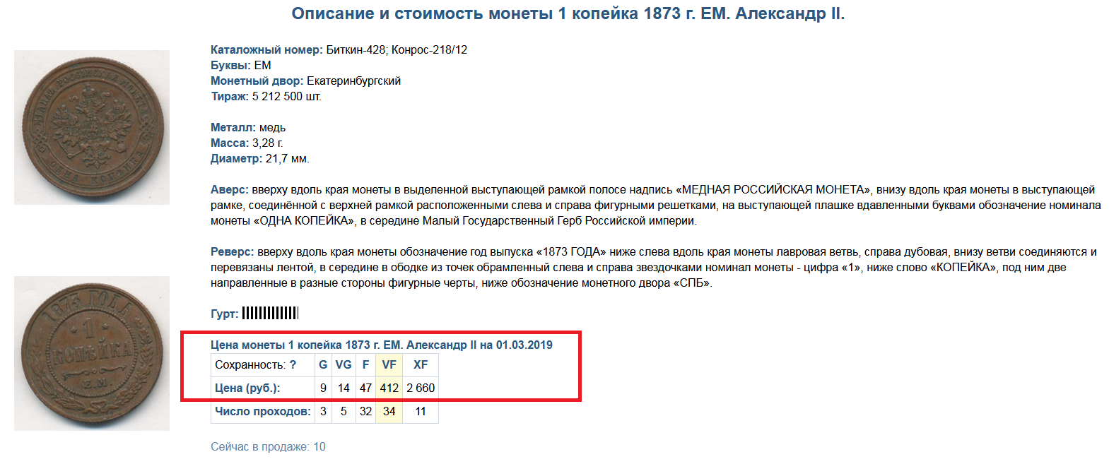 Случайно завалялась монетка (подлинная) 1 копейка, вроде как медная, 1873 года. Насколько она интересна может быть для коллекционеров?