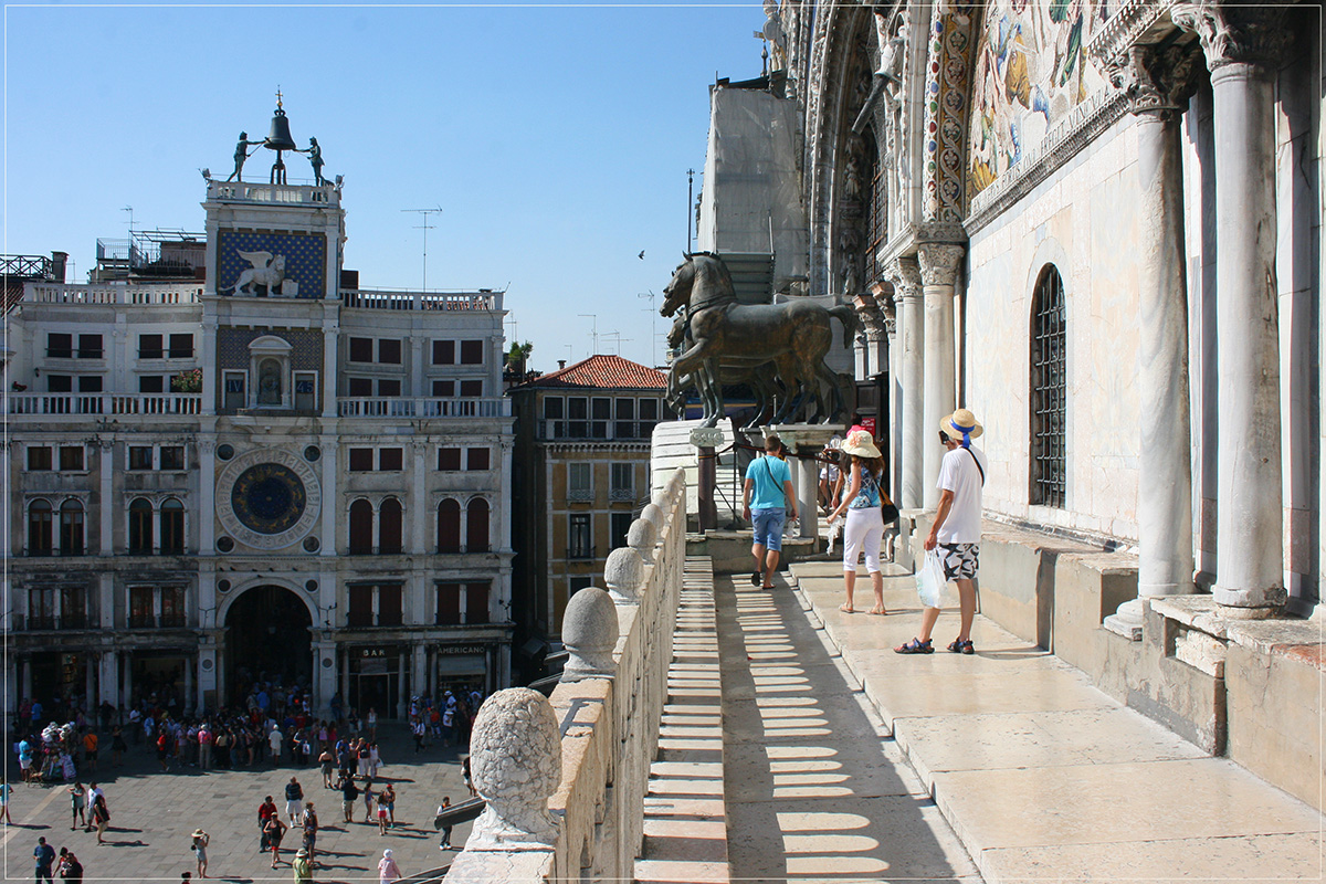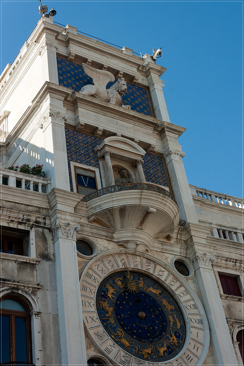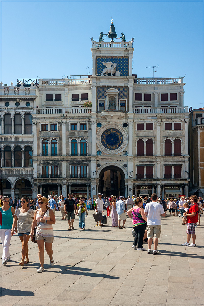 Часовая башня или, как её ещё называют, Башня мавров, находится в центре Венеции, на площади Сан-Марко, и является одним из самых известных памятников города. Сама башня была возведена в 1496 - 1499 годах архитектором Мауро Кодусси. Впоследствии были добавлены два боковых крыла. Две бронзовые фигуры (за тёмный цвет их прозвали маврами), отбивающие время, выполнены в 1497 Амброджо делле Анкоре. Фигурки похожи друг на друга, но есть и отличия. «Старый» мавр с бородой олицетворяет прошлое, он ударяет в колокол за 5 минут до наступления точного часа, а «молодой» безбородый мавр ударяет в колокол на 5 минут позже, олицетворяя будущее. Астрономические часы башни – шедевр механиков Джампаоло и Джанкарло Раньери (1499). Часы показывают времена года, часы, лунные фазы и переход Солнца из одного созвездия в другое.. Часы снабжены дополнительным механизмом, который, по традиции, запускается на Богоявление (приход волхвов): крутится карусель часов, и выезжают традиционные рождественские фигурки и фигурки волхвов. Часовая башня построена в стиле эпохе Возрождения. В основании башни открывается арка, ведущая в торговую часть города. Над аркой находится циферблат часов, выполненный из синей эмали и золота. Циферблат разделен на 24 часа, а указатели на полдень (XII) и полночь (XXIIII; было принято именно такое написание) расположены на горизонтальной оси. В нише над часами установлена статуя Богородицы. Ещё выше размещён венецианский крылатый лев. Крыша башни выполнена в форме террасы, на которой установлен колокол и бронзовые фигурки мавров. -------------------- Улыбайся сегодня, завтра будет хуже.