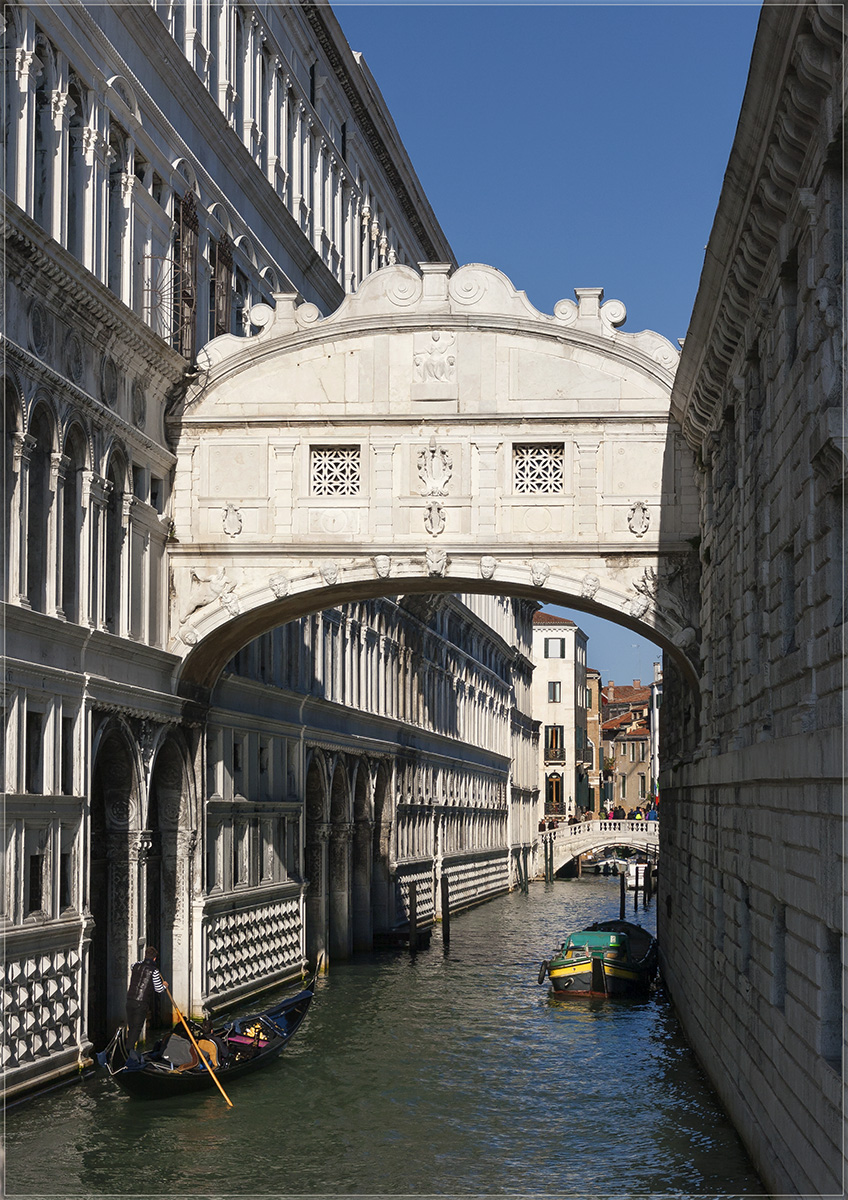 Мост Вздохов был построен Антонио Конти в 1602 году и украшен в барочном стиле. Мост соединяет здание Дворца дожей, в котором располагался зал суда, и здание тюрьмы. «Вздохи», от которых берет название этот мост — это не вздохи влюблённых, а печальные вздохи осуждённых, которые, проходя под стражей по этому крытому мосту, в последний раз вдыхали свежий воздух через окна-решётки после смрада заключения, и в последний раз бросали взгляд на Венецию и на море,