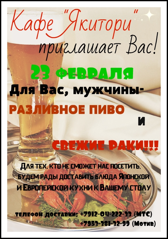 новый номер доставки +7912-04-222-33 (в счете дают визитку) Мы тоже посетили и очень порадовало качество блюд и обслуживание, говорят новое руководство))) И разливное пиво появилось, даже темное, очень вкусное - рекомендую Мне уже привезли визитку с заказом, вкусно приготовили роллики и креветки в темпуре...и быстро )))а главное горячие роллы были действительно горячими! в фольгу завернули и толстенький контейнер, молодцы! -------------------- Лучше молчать и показаться дураком, чем заговорить и развеять все сомнения.....)))