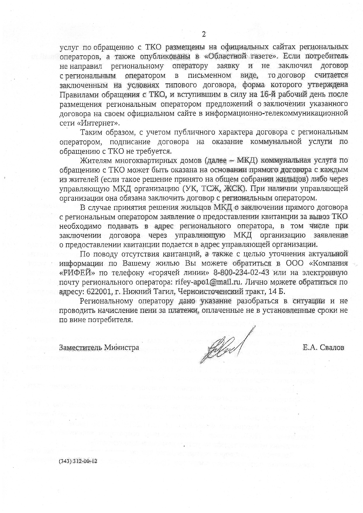а звонить принципиально не собираюсь, после 1 мая снова отправлю на министра тоже обращение, пусть сам звонит рипею! Чего и всем советую - валите министра обращениями!!! Какой ответ можно получить от министра? Он ссылается на те пункты которые им выгодны. Что Рифей, что министерство - это одна компания - одним словом - мафия мусорная. Ответ зам министра г Свалова - при заключении договора в области обращения с ТКО цены устанавливаются по соглашению сторон, таким образом тарифы явл. предельно максимальными и могут быть понижены по соглашению сторон. Это у нас соблюдено? За нас все решили и определили - все за счет народа. Если г Свалов да же не может ответить на конкретно поставленные вопросы, которые им не удобны. |