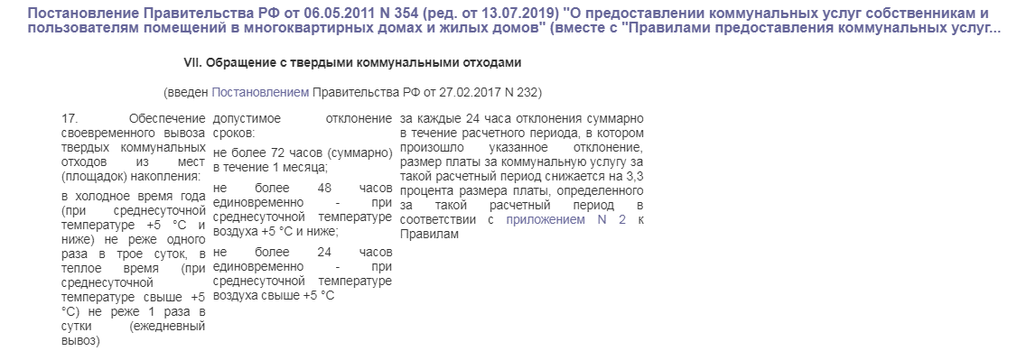 Вышло Постановление Правительства РФ от 13.07.2019 № 897,которое вносит изменения и дополнения в ПП РФ № 354 от 6 мая 2011 г. Вот и делаем соответствующие выводы.Вывозить мусор будут реже,площадки убирать Рифей не будет,согласно договору,а тариф заоблачный. Я может как то понял неправильно. Но вроде как они могут педалить с вывозом, мы в таком случае будем платить 96,7% из 100 за услугу, ну типа за ненадлежащее исполнение. Т.е. короч можно не возить или возить через пять раз и получать 96,7%. Пусть другие почитают, может я не так понял... |