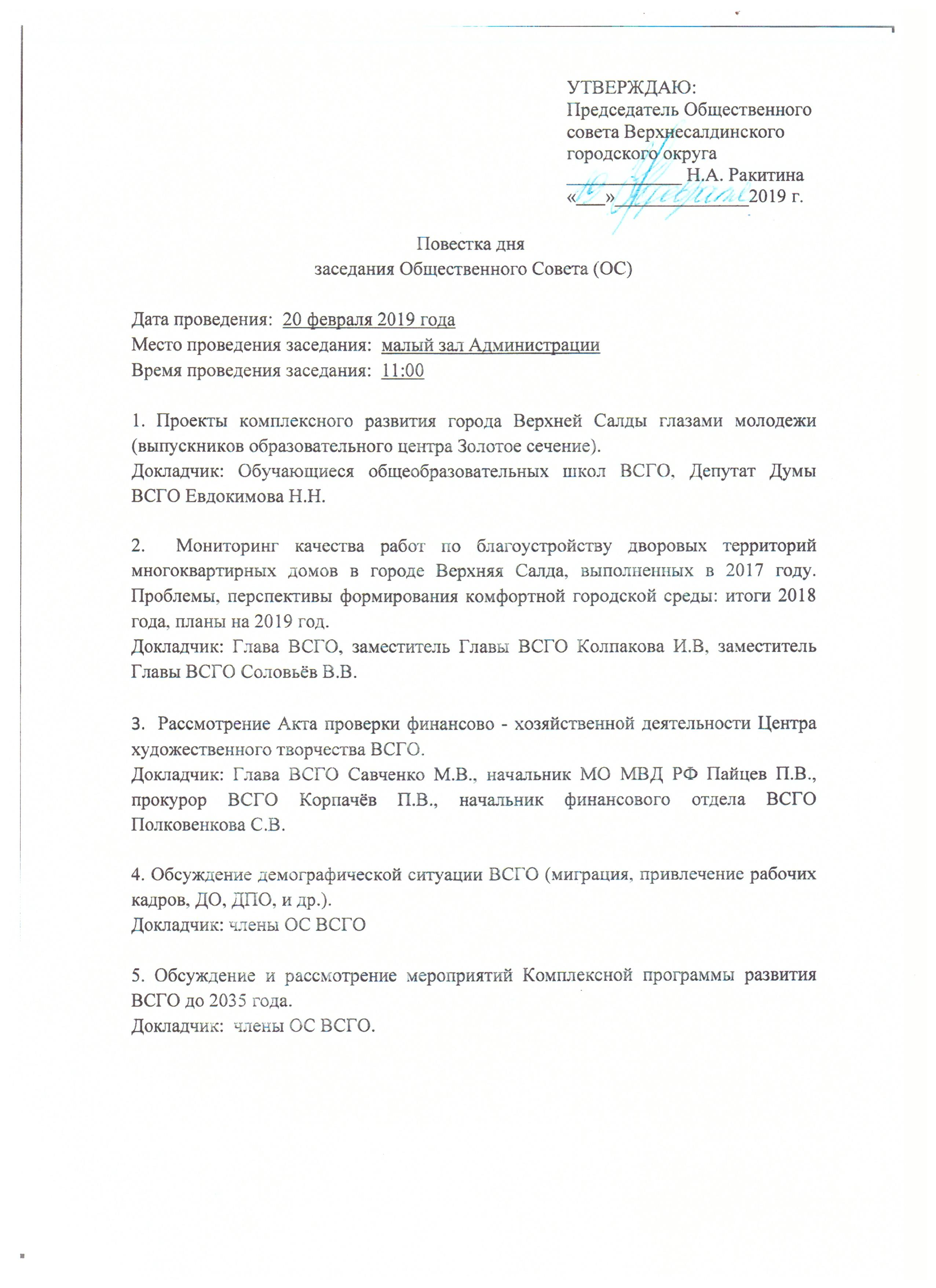 1. 19 февраля не дата составления повестки, а дата ее окончательного утверждения 2. Основание отказа - правила проведения Общественного совета, приведенные в предыдущей записи. Прочитать их полностью можно здесь - http://v-salda.ru/upload/iblock/130/39-1.pdf Перенос заседания в другой кабинет был сделан по причине неисправности презентационного оборудования в малом зале. 3. Присутствие заинтересованных лиц на рассмотрение акта проверки не предусмотрено, это не судебное заседание. Патша, если есть желание получить ответы из первых рук, Вы всегда можете записаться на личный прием к Главе округа, они проходят по четвергам. Топоры и вилы для этого брать необязательно. |