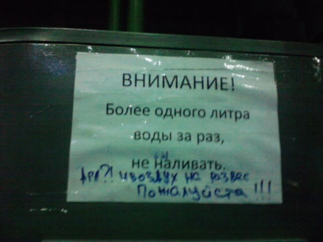 улыбнуло , вот такая обьява в горячем цехе ( приписку делала не я , оно уже так и было ...) это на самогон.., ой , на газировочном аппарате висит ..., не .., может оно чем то и аргументировано, но тогда бы сделали продолжение почему нельзя...???, Мне тоже интересны аргументы. Почему в установку. Которая предназначена для наполнения одного стакана за раз. Суют бутылку в 5 литров? Быдло, не!? Или просто русские!? |
