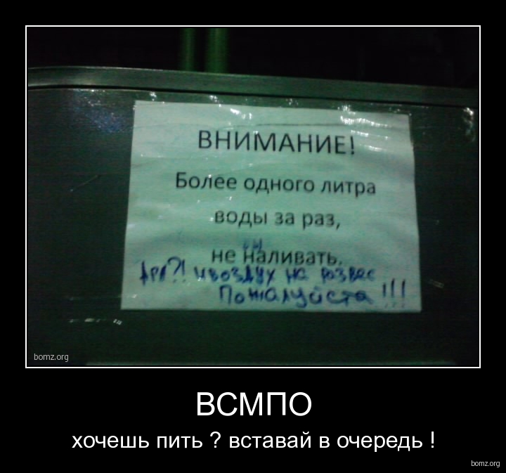 улыбнуло , вот такая обьява в горячем цехе ( приписку делала не я , оно уже так и было ...) это на самогон.., ой , на газировочном аппарате висит ..., не .., может оно чем то и аргументировано, но тогда бы сделали продолжение почему нельзя...???, за раз - это какой промежуток времени должен пройти ...??? а если рабочий, которому тупо от своего рабочего места всю смену не отойти , наберет 2 литра, что ему за это будет ? талон вырвут или премии лишат ?? а может там кассира поставят и воду продавать начнут ??? кстати подсказка можно еще продавать воздух , рукавицы, рабочий инструмент и саму возможность - работать !!! ну вот уже и воды жалко стало!!! -------------------- Слава России!!! И один в поле воин, если он по русски скроен!!! Только в борьбе обретешь ты право свое!!!