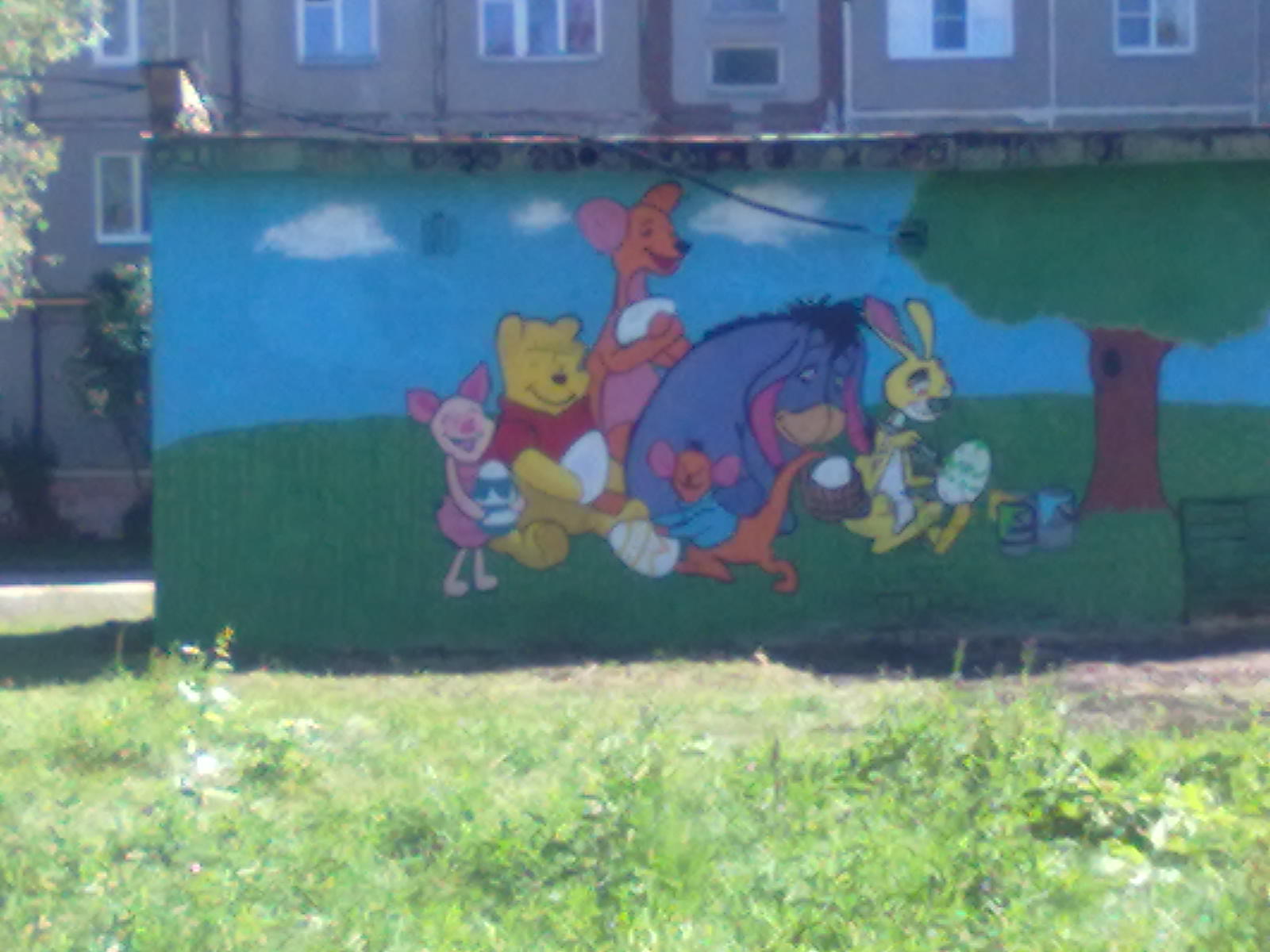 Вчера проходила после работы мимо техникума, любовалась второй серией "Ну-погоди", молодцы ребята! Столько ребятишек было вокруг художников, все в восторге! Мальчики сказали. что завтра будут диснеевский мультик рисовать где то на Спортивной, обязательно схожу посмотрю, ничего подобного в городе раньше не видела. Спасибо всем кто имеет отношение к этой красоте! Винни-Пуха рисуют |