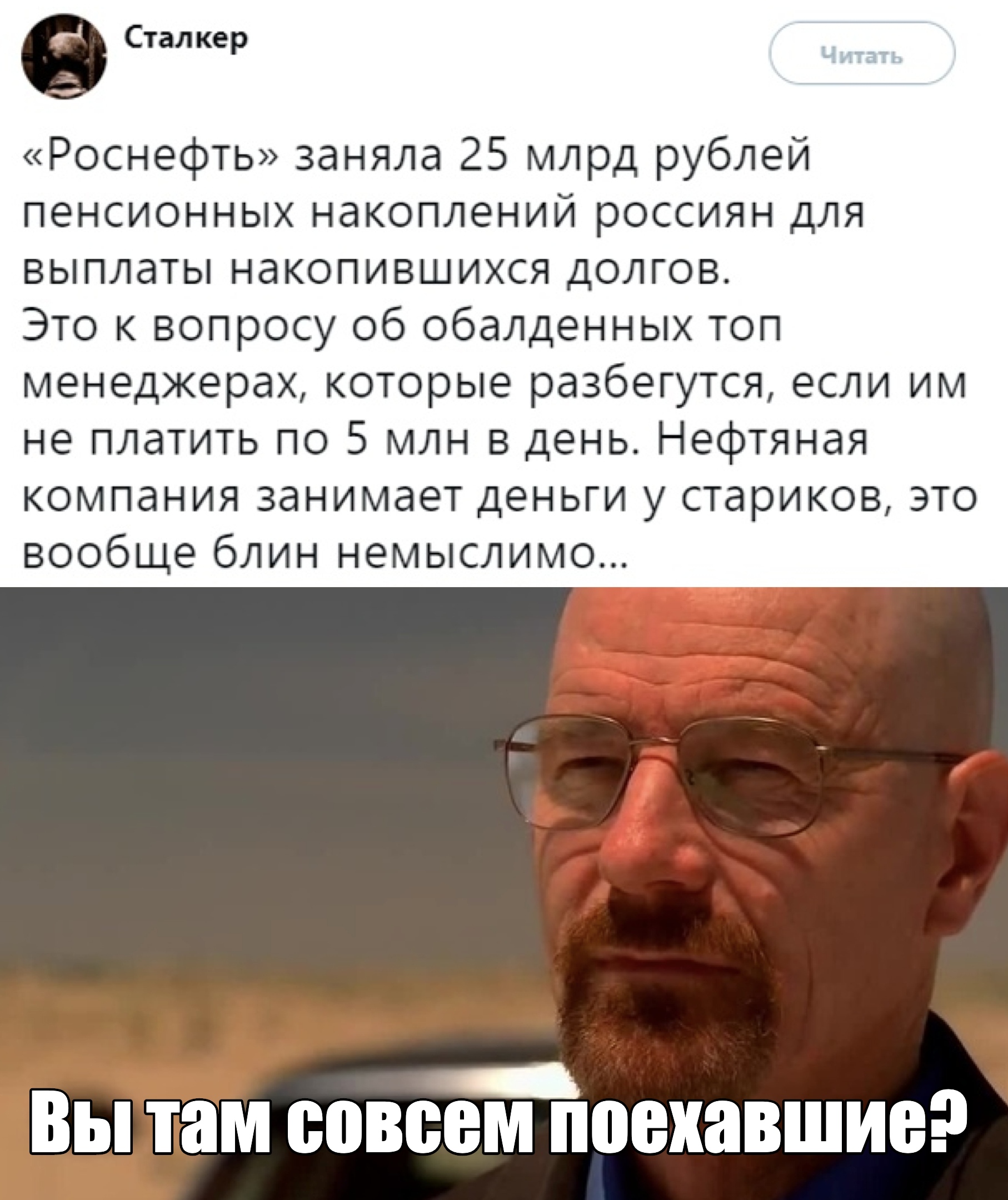 Я думаю , что до большинства населения эта проблема еще не дошла.Молодежь надеется на русское авось , предпенсики находятся в информационном шоке , не веря до сих пор , что их просто внаглую обокрали. Причем в очередной раз. Почему нас уверяют , что пенсионеров должно кормить "текущее" работоспособное население ? Банальный вопрос , уже набивший оскомину - где наши накопления ? Допустим , человек 30 лет платил усердно и НДФЛ официально , и взносы в фонды предприятие платило. А у человека может быть и не одна ОФИЦИАЛЬНАЯ работа. В чьем кармане ? Чубайса , Чемезова , Медведева ? А постоянные скандалы с ПФ ? Вопросов куча , а ответы замалчиваются. Я уже не говорю про доходы с газа и нефти, это вообще личный капитал зажравшихся морд и какое то табу. Хотелось бы выслушать мнение дальновидных людей по этому вопросу. Сообщение отредактировал Serg70 - 14.7.2019, 21:17 -------------------- Умный в гору не пойдет...
