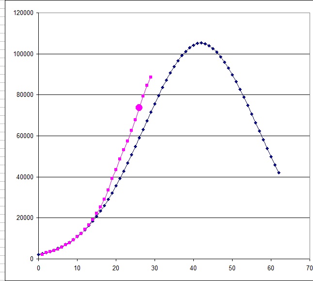 Отличная кривая у нас есть с линейной интерполяцией. Синий - это прогноз, который был сделан 10 дней назад на офф. сайте. Красный - реальные данные по числу выявленных болеющих. Специально не беру более свежий прогноз - интересно на сколько наврали. Видно, что реальная ситуация протекает усиленно, но точка перегиба осталась в том же месте. Максимум только будет смещён и растянут - потому что у вируса 14-18 дней период болезни. Гаусс рулит:).