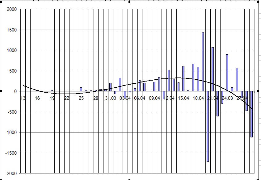 Вот, выделил точку перегиба. И график абсолютного прироста к предидущему дню. Видно что, динамика скорости прироста перевалила через ноль и стала отрицательной. Средствами экселя здесь линия тренда полином 3 порядка. В начале там особо не интересно. На втором графике по вертикали суточный прирост в человеках. Сообщение отредактировал volkov - 29.4.2020, 20:14 |