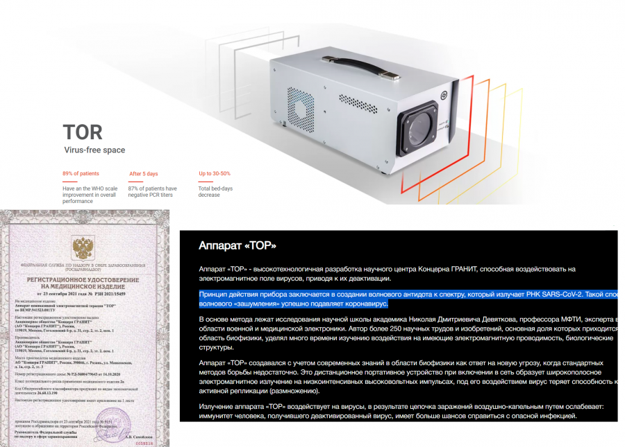 Как "дистанционное подавление вируса " угрожает здравоохранению. Копипаста с блога Александра Панчина https://scinquisitor.livejournal.com/194792.html Недавно меня позвали на медицинский форум «Биотехмед» в качестве спикера. В силу ряда обстоятельств мне не удалось озвучить в своем коротком выступлении проблему, ради обсуждения которой я приехал в Геленджик, поэтому озвучу ее текстом. Тем более что появилась новая иллюстрация проблемы – в РФ зарегистрировали «медицинский прибор» «аппарат дистанционного подавления коронавируса». Об этом чуть ниже. Не секрет, что в России огромный процент населения не доверяет отечественным вакцинам от коронавируса SARS-CoV-2 и отказываются прививаться. Это в свою очередь способствует как ухудшению эпидемиологической ситуации, так и повышению риска появления и распространения новых разновидностей вируса. Традиционно существует небольшая прослойка фанатичных противников любых вакцин. Их мотивы не рациональны, а аргументы смешны. Но против вакцинации российскими вакцинами выступают не только они. Сам я привился вакциной «Спутник V», а позже ревакцинировался «Спутником лайт». Аналогично сделали мои родители, и я бы хотел, чтобы моему примеру последовало больше людей. Но я не могу отрицать, что в недоверии к вакцинам из России есть некоторое рациональное звено и это проблема, которую надо решать. Для людей, знающих английский язык, биологию и имеющих базовые представления о научном методе и статистическом анализе не составляет труда ознакомиться с данными клинических исследований по той или иной вакцине, разобраться в научных публикациях и принять решение прививаться. Но большинство людей никогда не интересовались упомянутыми вопросами и вынуждены оперировать эвристиками. Например: «одобрен ли препарат для применения в России», «одобрен ли он зарубежом», что об этом говорят специалисты? Специалистов в России настиг кризиса научных репутаций. Низкий уровень квалификации части людей, работающих в сфере науки и медицины, приводит к тому, что выходит настоящий доктор медицинских наук и на полном серьезе рассказывает, как вакцины сделают из вас ГМО. И приходится потом пояснять, что с теми же аденовирусами люди сталкиваются постоянно, причем с полноценными, а не с обезвреженными векторами. А значит по такой логике, мы уже все ГМО. Да и сам тезис о том, что ГМО – это что-то плохое мы слышим от иных докторов наук, верующих, что мужчины произошли от амазонок гермафродитов. Добавим к этому какого-нибудь члена-корреспондент РАН, который предлагает лечить диабет гомеопатическим сахаром. Короче говоря, формально можно найти специалиста, который будет нести абсолютно любой бред. А сама экспертность часто, увы, не про знания, а про сомнительные, легко подделываемые или покупаемые регалии и упоминания в СМИ. Необходима борьба с такими подделками и более аккуратный подбор экспертов. С доверием к государству ситуация не лучше. Если я захожу в аптеку, то вижу, что больше половины препаратов на витринах, мягко говоря, сомнительны. Там и гомеопатия из печени утки и релиз-активные препараты и беджики от коронавирусов и всевозможные БАДы без доказанной эффективности. Если взять случайный зарегистрированный препарат и попытаться наобум угадать работает он или нет, более вероятно, что не работает. На фоне этого у рационального че