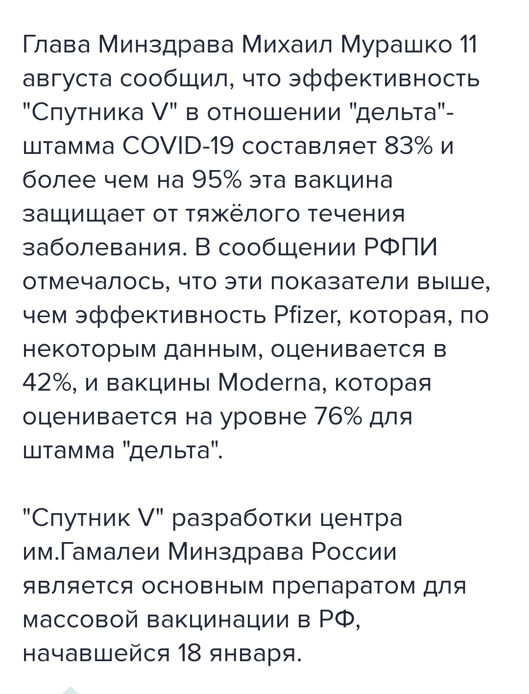 Данные с сайта https://sputnikvaccine.com/rus/about-vaccine/results/ Эффективность "вакцины": 97,6%, побочных явлений не имеет. Против заражения "дельтой" - 83,1% против госпитализации от "дельты" - 94,4%. Кто тогда заражается? Если 60% взрослого населения имеют "коллективный иммунитет"? Опять "проклятые антиваксеры"? |