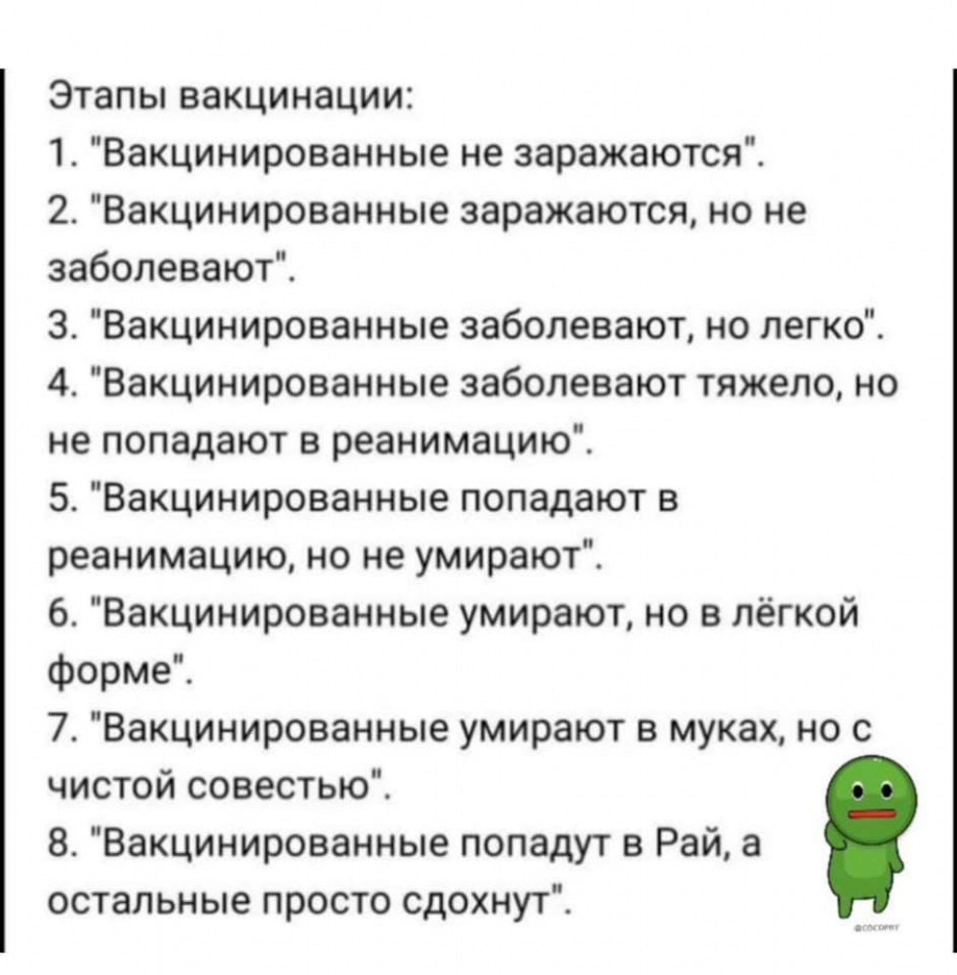 Даже условно-оппозиционные фракции объявили, что будут голосовать против QR-кодов и на них тут же наклеили ярлык антипрививочников, как и на тех кто выступает против этих ограничений и прочей принудиловки. Это очередной идиотизм власти. Назвать противников QR-кодов антипрививочникам это все равно что назвать вполне здорового мужика импотентом только потому, что он против изнасилования женщин. Путин.В.В - , в очередной раз выступил против принудиловки : решение россиян по прививкам от коронавируса должно быть добровольным. (с), буквально сегодня..., Ну правда кто он такой, чтобы его губернаторы и прочая недовласть послушалась.. -------------------- УСТУПАЙ ДОРОГУ ДУРАКАМ ...