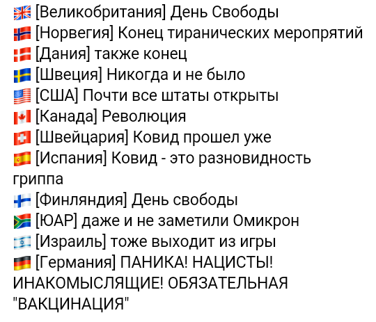 "В Европе начинается просто обвальный выход из ковидных ограничений. Где-то они снимаются полностью, где-то остаются внешние атрибуты вроде масок и «социальной» (на самом деле санитарной, но на эти мелочи уже давно не обращают внимания) дистанции. Выходят Великобритания, Дания, объявила о выходе Норвегия. В определенном смысле это реакция на происходящий бунт дальнобойщиков в Канаде и поддержавших их европейских коллег. Власти понимают, что ситуация на грани, и совершенно не горят желанием прятаться в подвалах, как канадский премьер. Теперь мяч на стороне глобалистов, которые немного, но не успевают. Для тех, кто проектировал нынешний геноцид, было бы крайне важно дотащить ситуацию в нынешнем положении до лета: там и Давос, где будет вырабатываться новый консенсус, там и подписание Пандемийного соглашения, обязательного для всех. Но увы — только начало февраля, а «держаться больше нету сил» ©. И национальные правительства выскакивают и проекта, понимая главное: тот, кто выйдет последним, огребет последствия по полной программе. В этом смысле позиция российских властей неопределенная: регионалы уже открыто высказываются против ограничений. Один из губернаторов позволил себе то, что ранее было дозволено только руководству Татарстана и Чечни ввиду их эксклюзивного статуса в российской вертикали — внешнеполитические заявления. Губернатор Курганской области Шумков заявил о необходимости трибунала над «зачинателями» пандемии. Которые сидят явно за пределами России. Однако ставленники глобального фашизма — в первую очередь связанные с фармлобби высшие чиновники продолжают требовать соблюдения и даже ужесточения ограничений, вакцинирования, в том числе и детей. Их понять можно: они просто передаточное звено, банальные капо в бараке. Своего мнения быть не может, да и замазаны они в таких преступлениях, что сильно уже не дернешься. Поэтому Россия продолжает идти в русле проекта «новой нормальности», хотя бойкот и саботаж нарастают снежным комом. Причем если ранее этим занималось в основном население, то теперь уже и власти начинают прибегать к саботажу во все возрастающих масштабах." https://lenta.ru/articles/2022/02/01/opening_up/ |