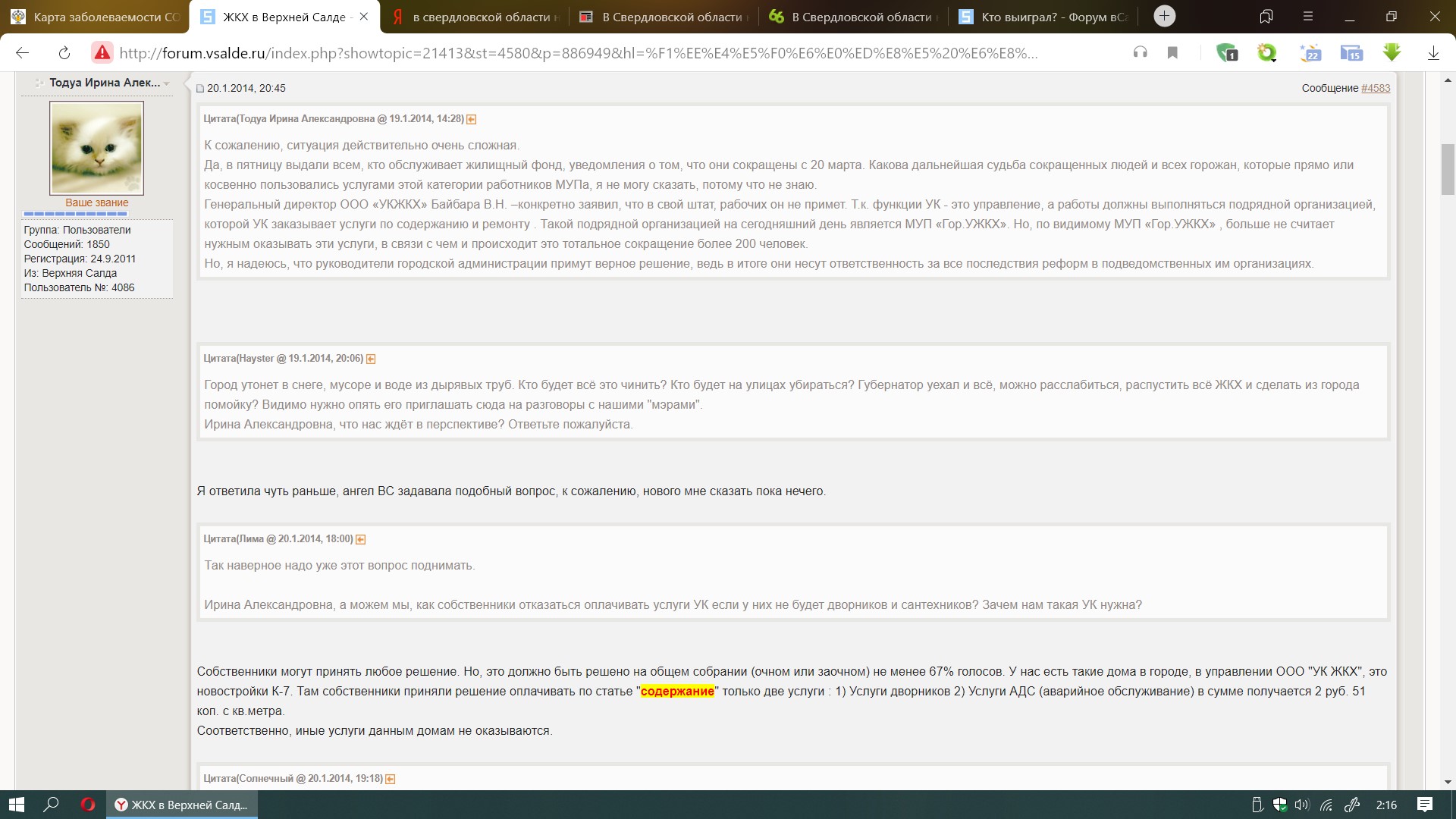 Короче вот, я не брехло, а человек с очень хорошей памятью на такие вещи Цитата Собственники могут принять любое решение. Но, это должно быть решено на общем собрании (очном или заочном) не менее 67% голосов. У нас есть такие дома в городе, в управлении ООО "УК ЖКХ", это новостройки К-7. Там собственники приняли решение оплачивать по статье "содержание" только две услуги : 1) Услуги дворников 2) Услуги АДС (аварийное обслуживание) в сумме получается 2 руб. 51 коп. с кв.метра. Соответственно, иные услуги данным домам не оказываются. Вот ссылка http://forum.vsalde.ru/index.php?s=&sh...st&p=886949 З.Ы. Удаляльщики сообщений ТИА, можете не подчищать, я заскринила! ![]() Сообщение отредактировал ZloVredina - 11.7.2020, 2:17 |