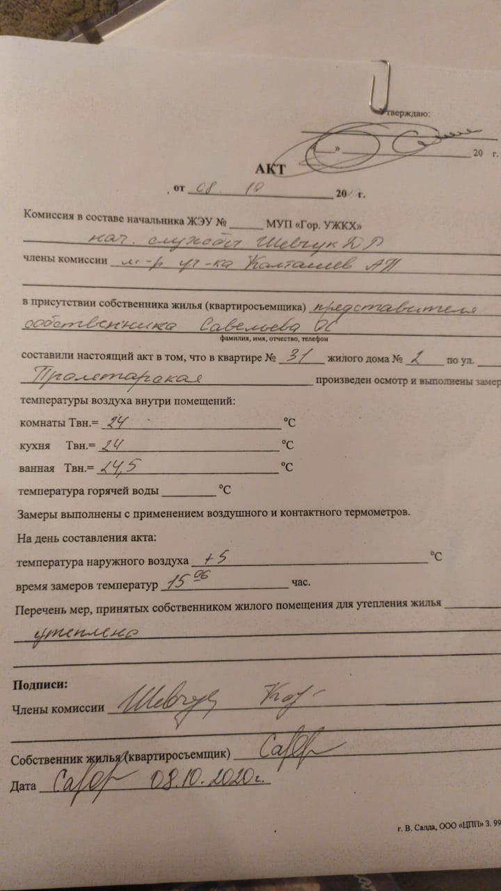 В 31 квартире кчастковые сантехники были, акт прилагается Почему в акте не зафиксирована температура обогревательных приборов (батарей) порсекционно? Тоже была 24є? Зачем они приходили? Зафиксировать, что жильцы успешно противостоят безответственности ЖКХ? Это же элементарные ошибки. И подписывает целый начальник службы... Какой начальник, такая и служба Сообщение отредактировал Никодим - 12.10.2020, 17:05 |
